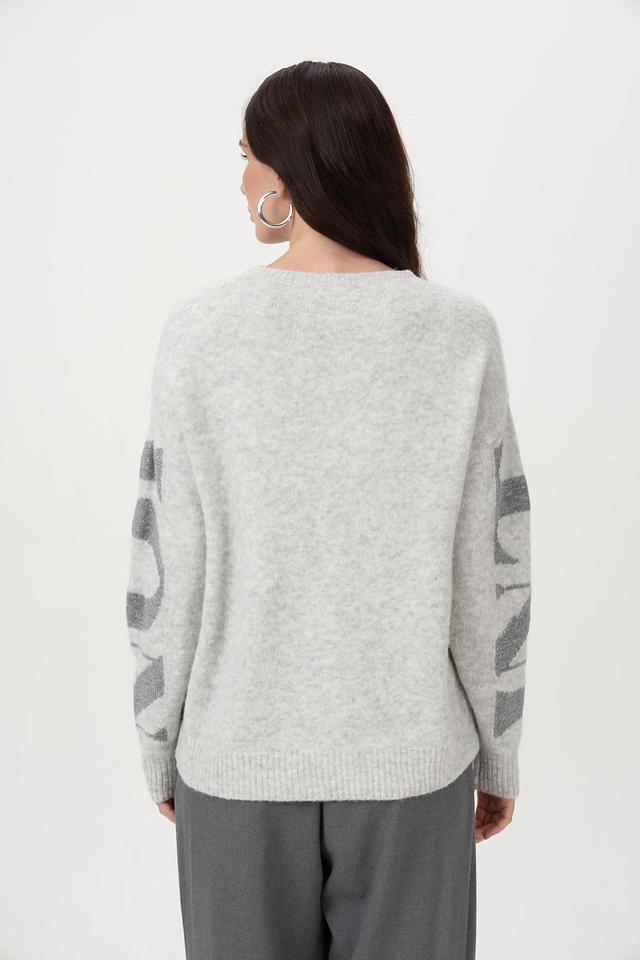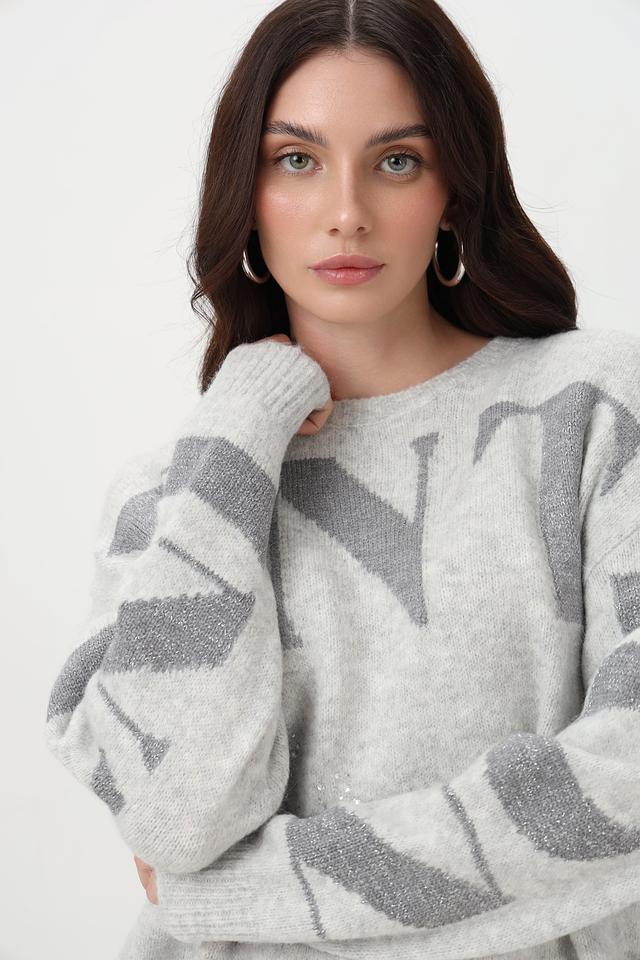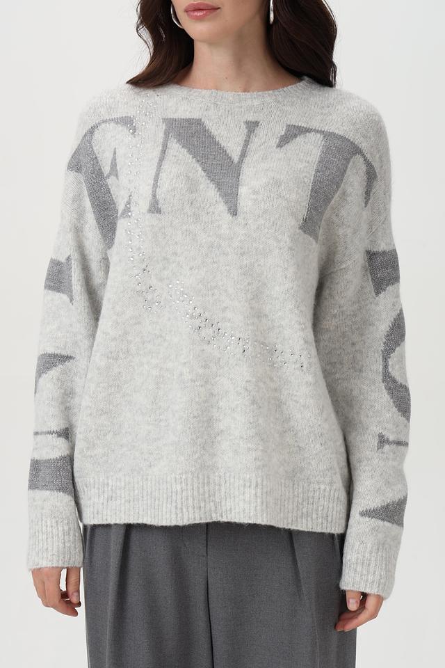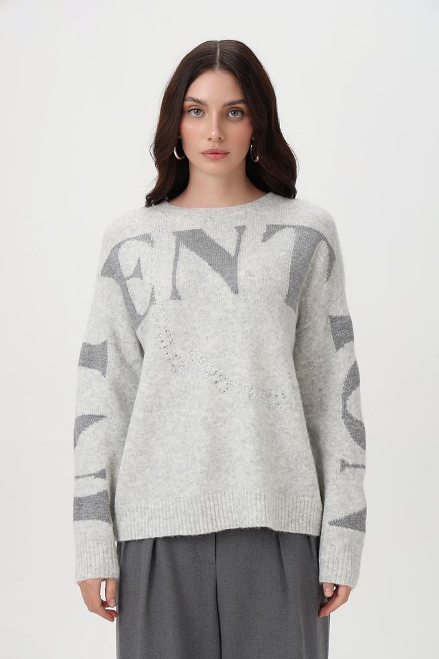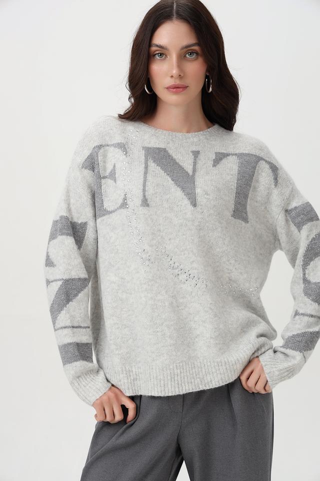 Пуловер имеет свободный крой, длинные рукава и классический вырез горловины. Особый акцент сделан на крупную надпись, выполненную с использованием пайеток, что придает изделию изысканность и оригинальность.