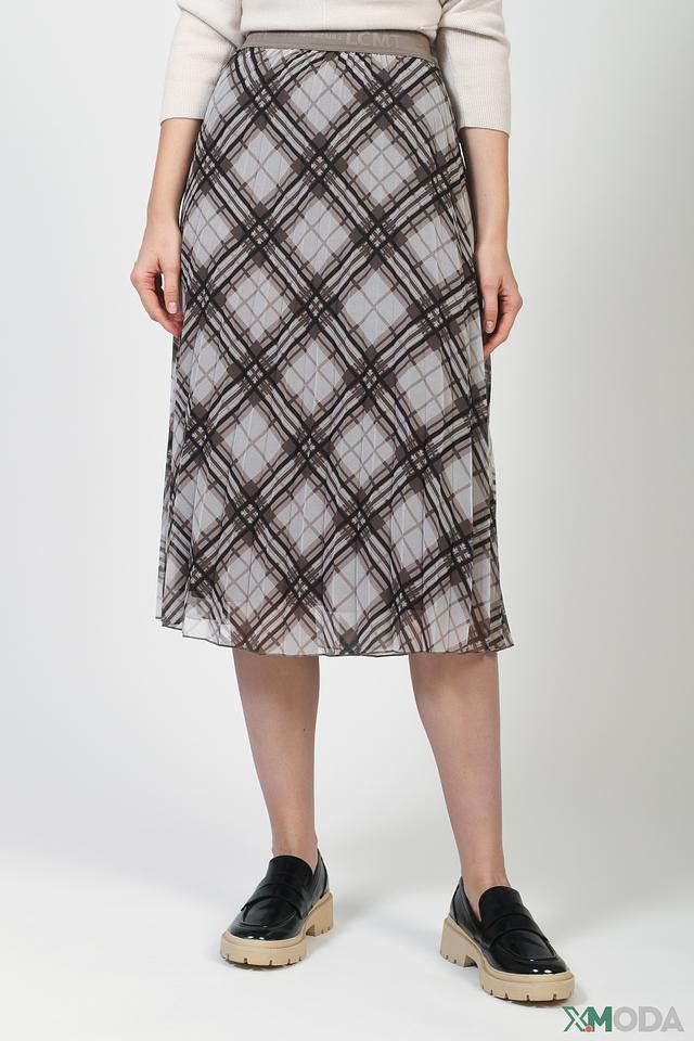 Юбка имеет классический крой плиссе и длину миди. Особенностью модели является клетчатый принт в сочетании серых, коричневых и белых оттенков. Эластичный пояс обеспечивает удобную посадку по фигуре.