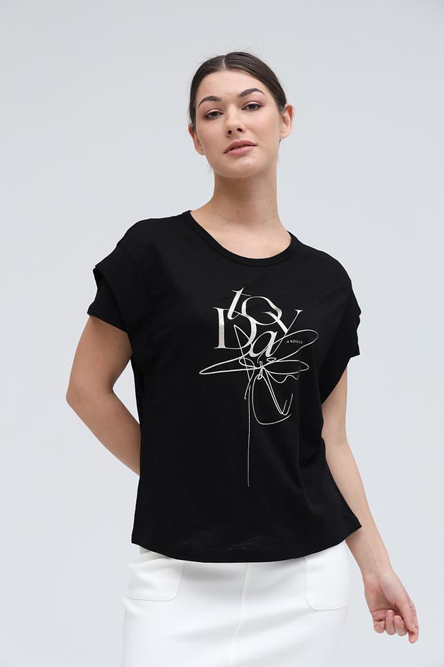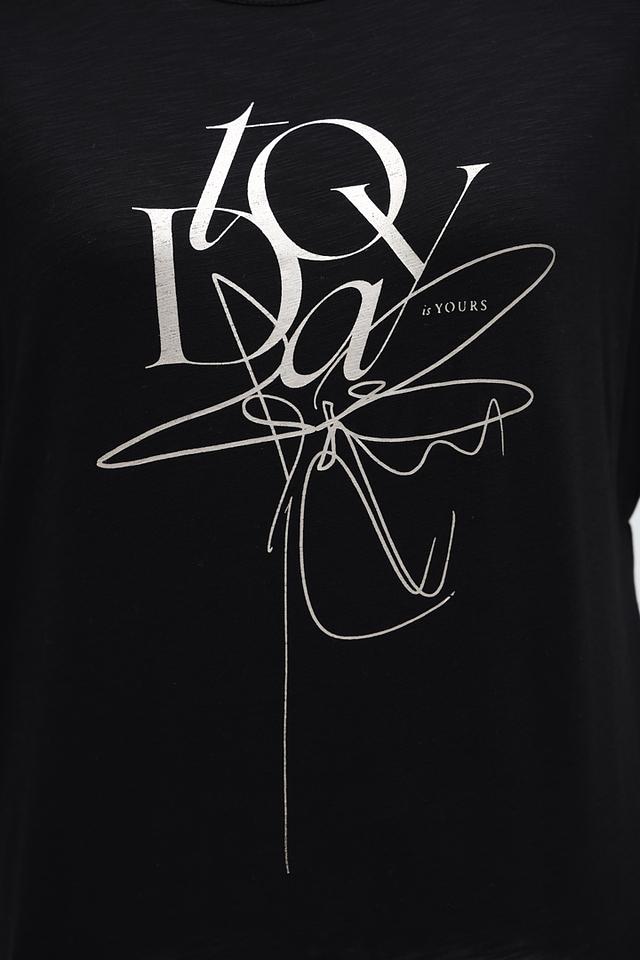 Модель имеет прямой крой и короткие рукава с небольшими складками у плеч, что придает ей особый шарм. Передняя часть футболки украшена стильным белым принтом, добавляющим образу индивидуальность.