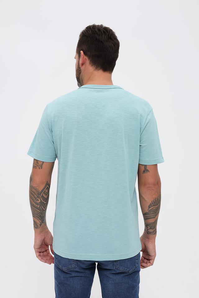 Футболка имеет классический крой и короткий рукав. Основной цвет – нежный мятный, который прекрасно сочетается с различными оттенками. Главная особенность модели – яркий принт с изображением пальм, добавляющий образу летнее настроение.