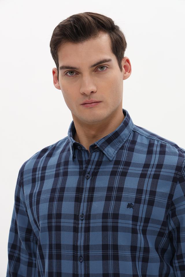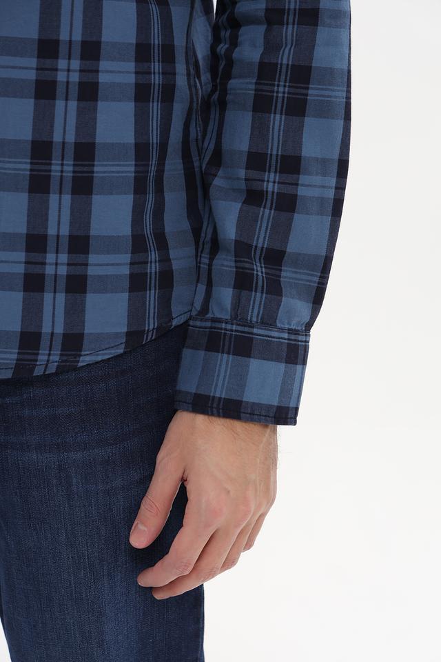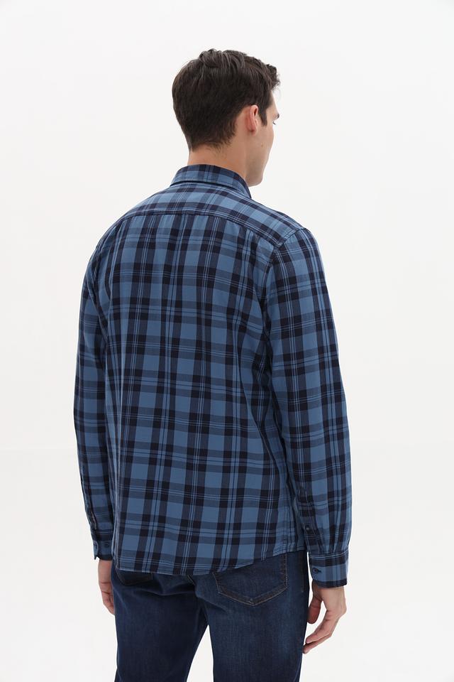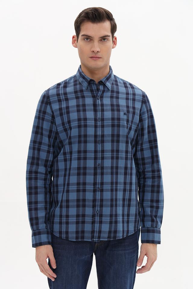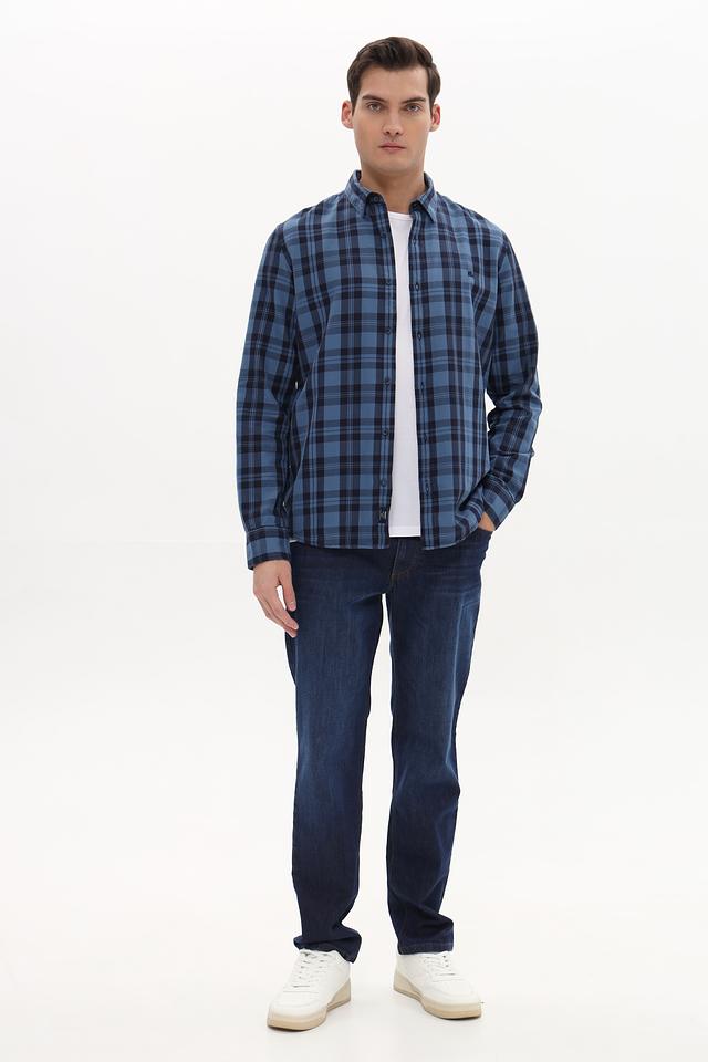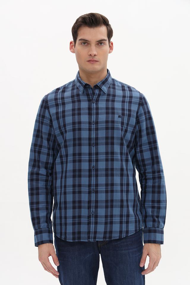 Основной цвет рубашки – синий, а рисунок представляет собой клетку, выполненную в сочетании синих и тёмно-синих оттенков. Такая расцветка делает рубашку универсальной и подходящей для различных стилей одежды.