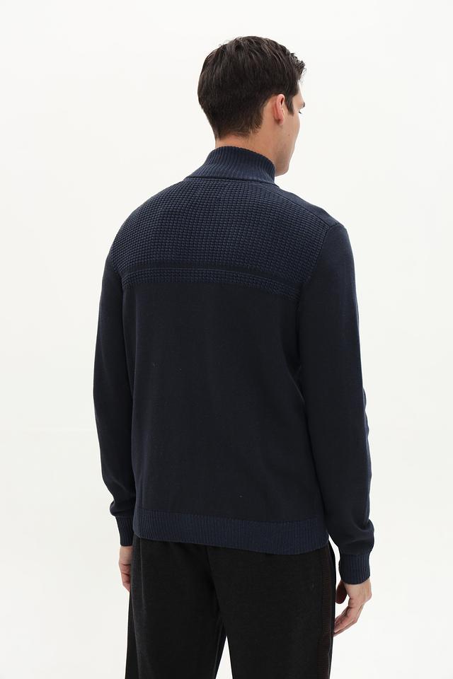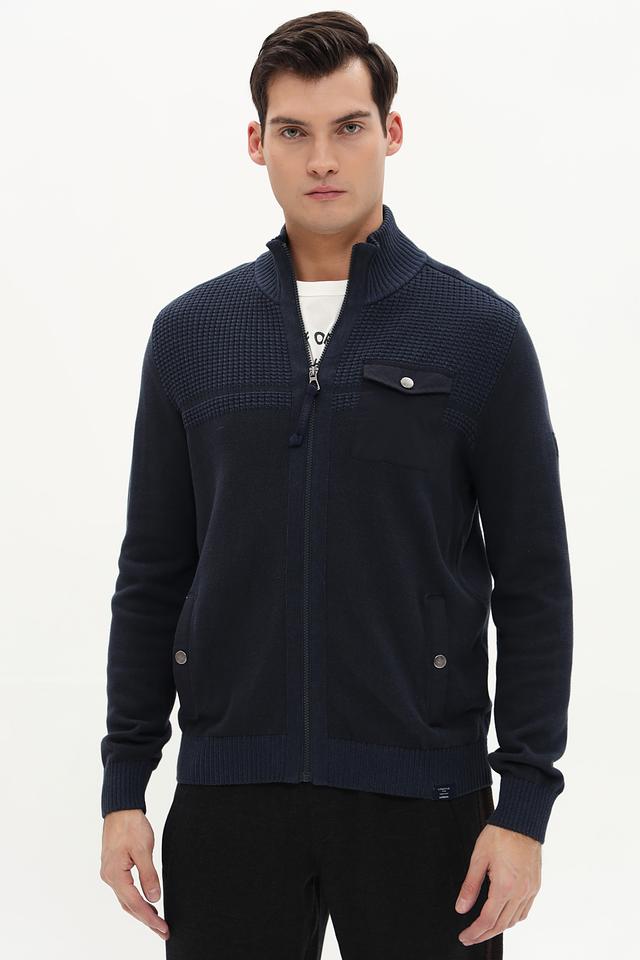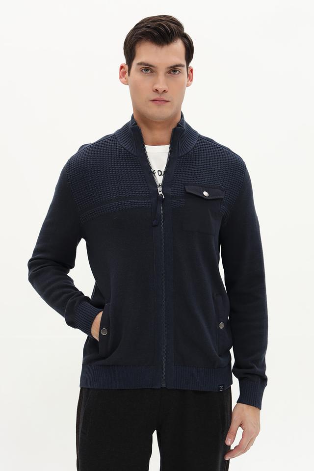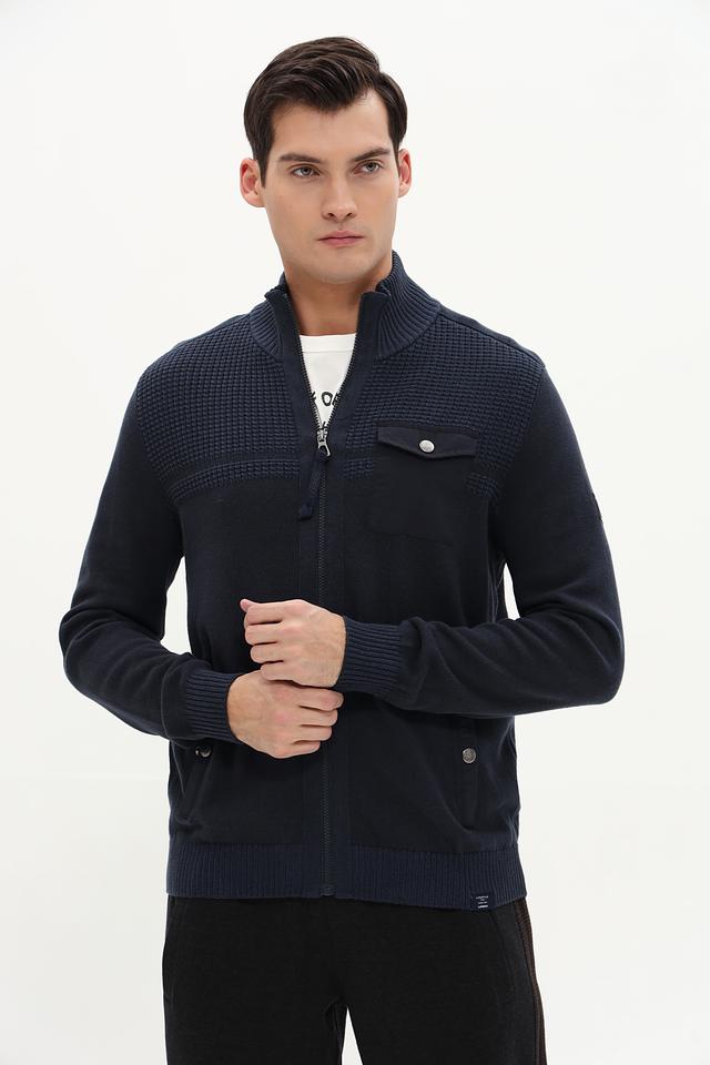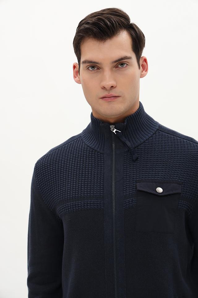 Кардиган имеет удобную застёжку на молнии, что позволяет легко регулировать степень тепла. Дизайн дополнен декоративными элементами: нагрудный карман с пуговицей и контрастная вязка на плечах и нижней части изделия. Рукава кардигана имеют манжеты, обеспечивающие комфортную посадку.