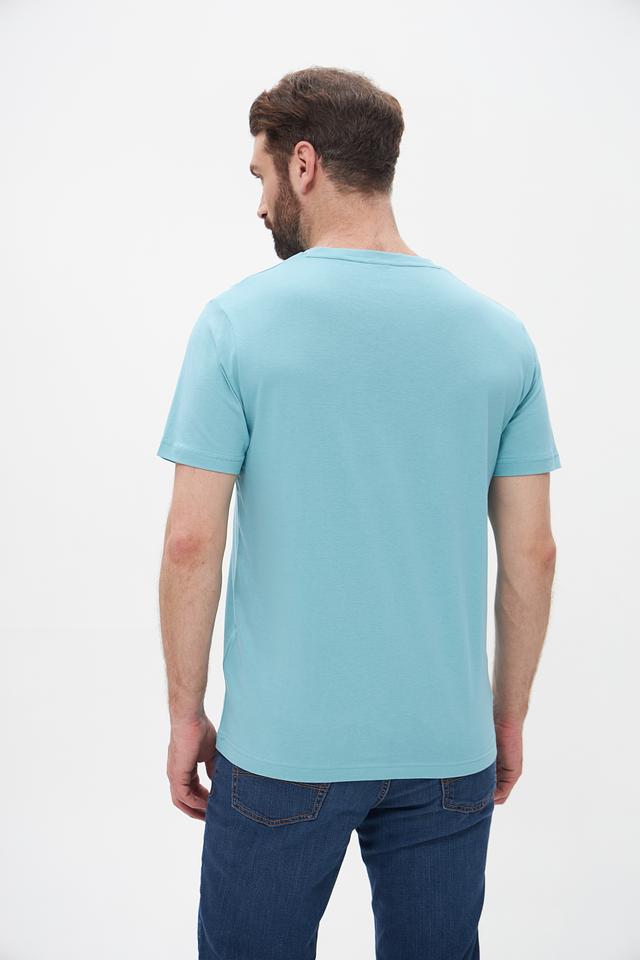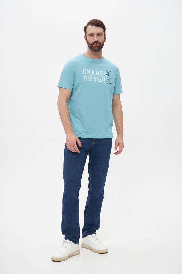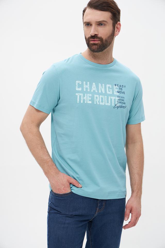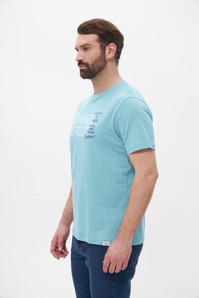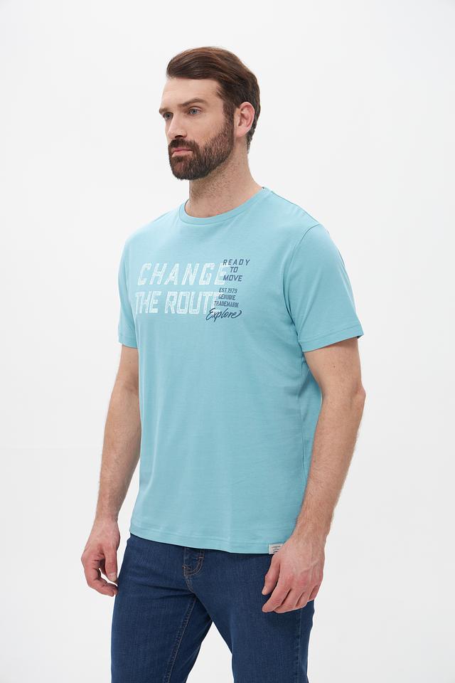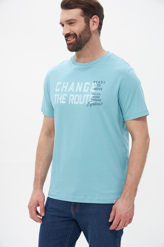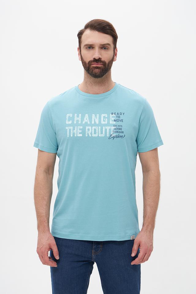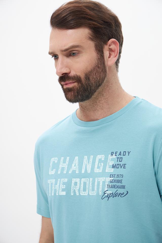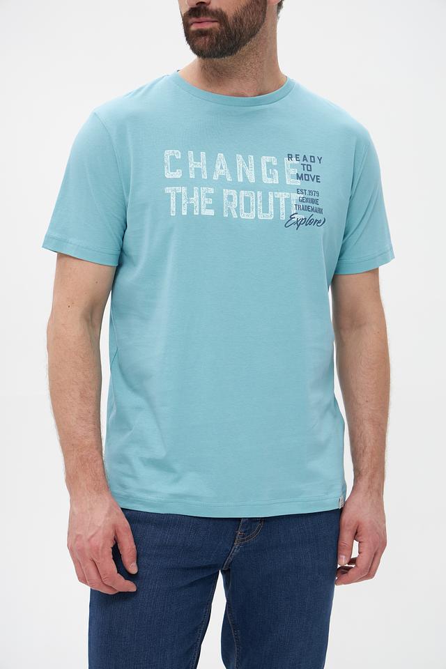 Основной цвет футболки – бирюзовый. На передней части изделия расположен крупный принт с надписью “CHANGE THE ROUTE” и дополнительными элементами, выполненными в белом и сером цветах. Принт придает футболке стильный и современный вид.