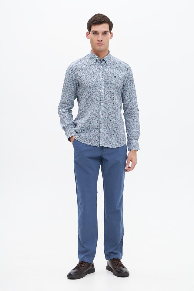 Модель имеет классический крой с длинными рукавами и воротником на пуговицах. Рубашка выполнена из высококачественного хлопка с добавлением эластана, что обеспечивает комфорт при носке и сохранение формы.