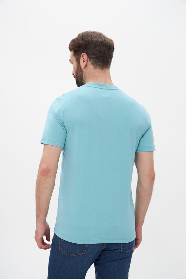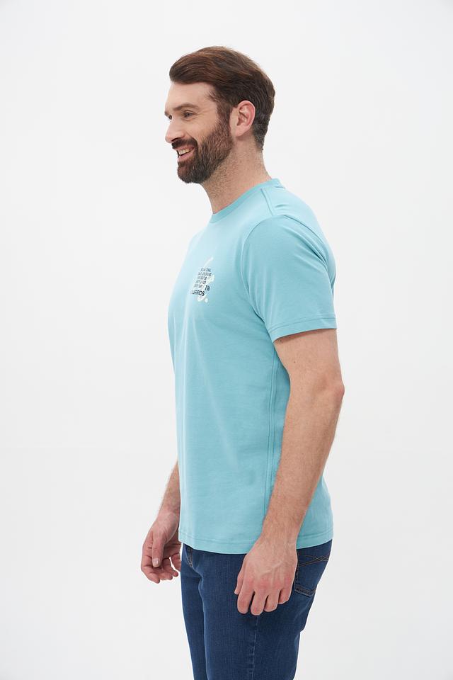 Футболка имеет классический прямой крой, который подходит для любого типа фигуры. Бирюзовый цвет придает образу свежесть и легкость. На груди располагается стильный принт, добавляющий индивидуальности.