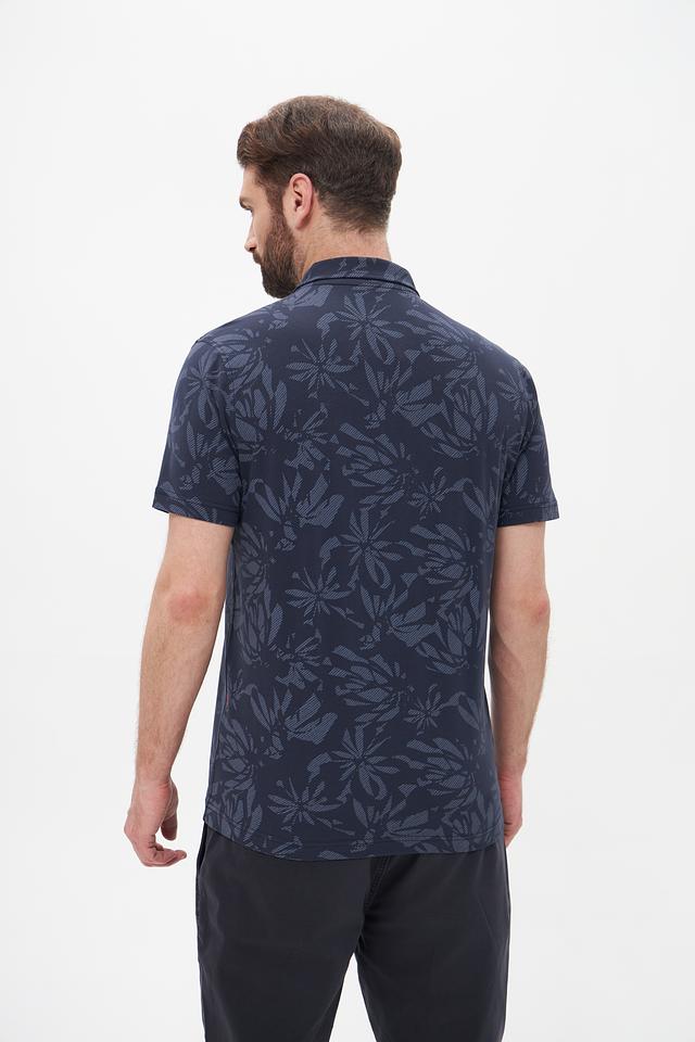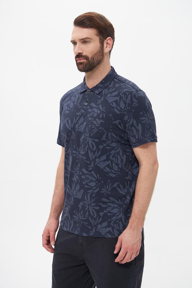 Поло имеет классический крой и короткие рукава. Главной особенностью данной модели является яркий и оригинальный цветочный принт, который придаёт ей индивидуальность и стиль. Тёмно-синий цвет поло отлично сочетается с различными элементами одежды, позволяя создавать разнообразные образы.