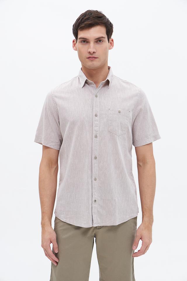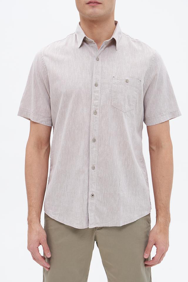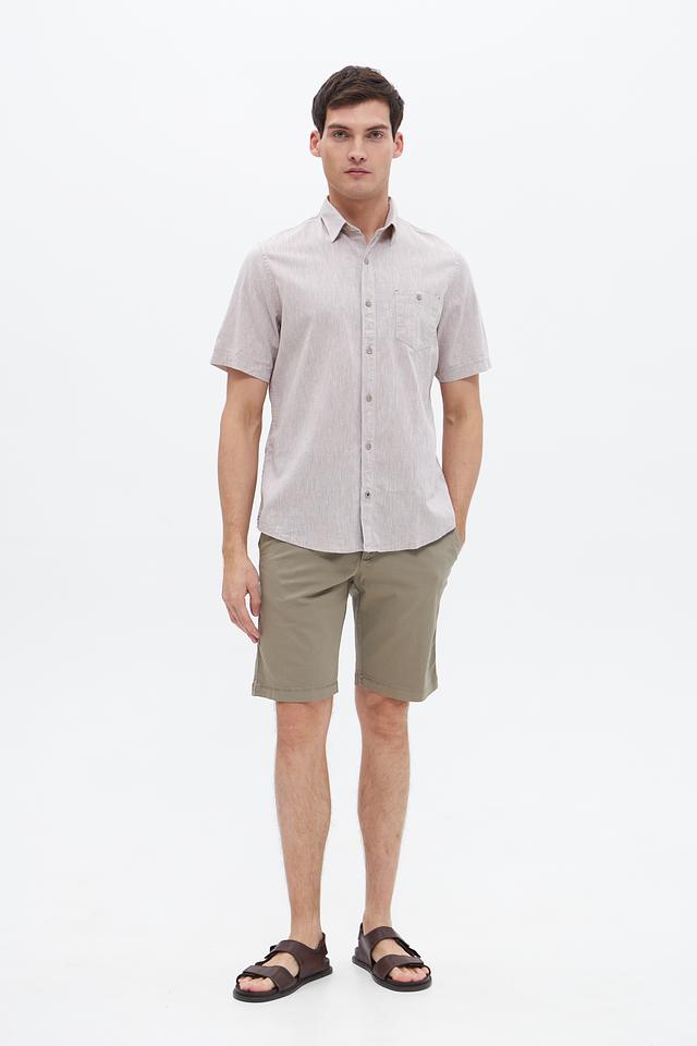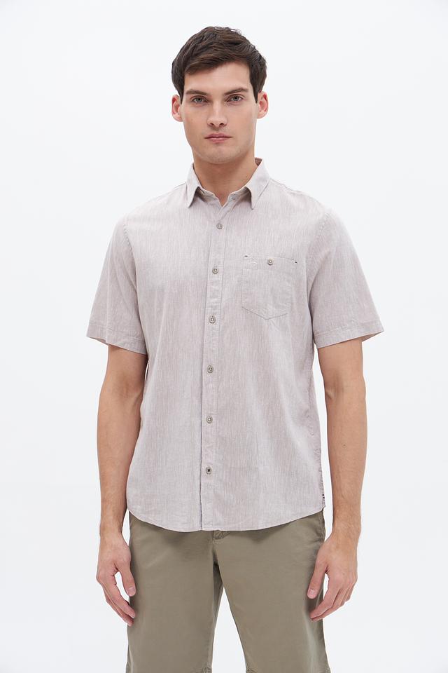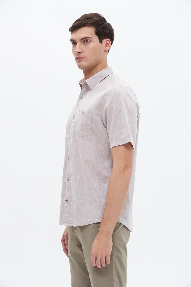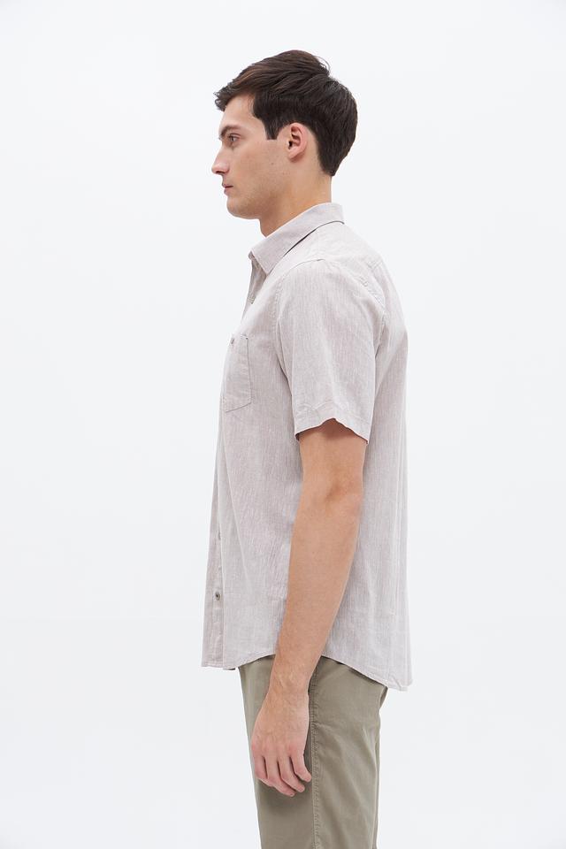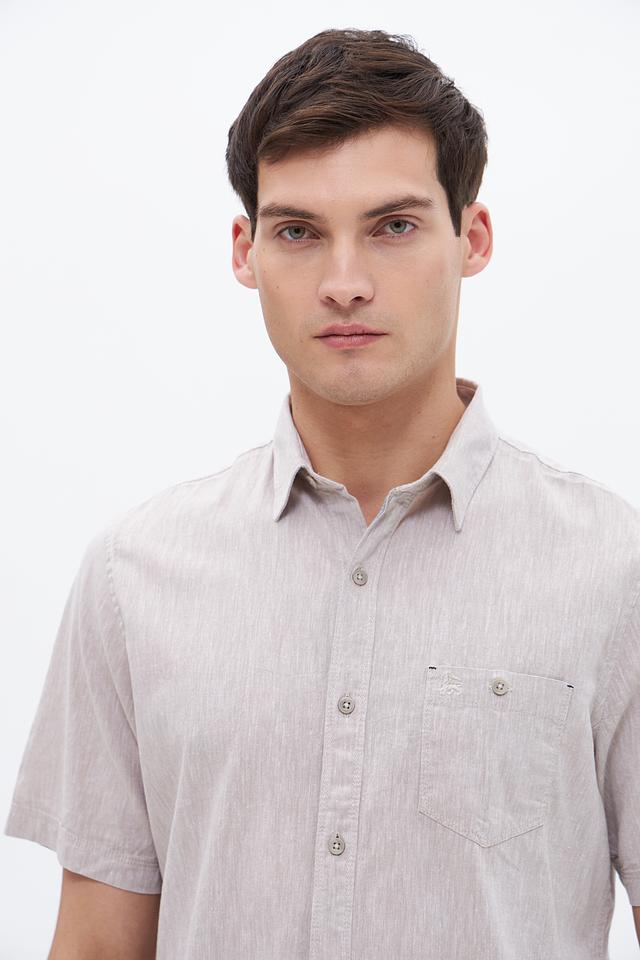 Мужская рубашка Lerros c коротким рукавом, выполненная в бежевом цвете. Изготовлена из хлопка с добавлением льна, что обеспечивает комфорт и воздухопроницаемость. Состав: хлопок 80%, лен 20%