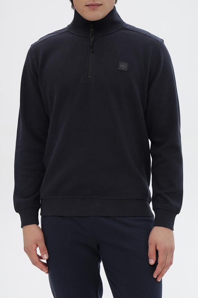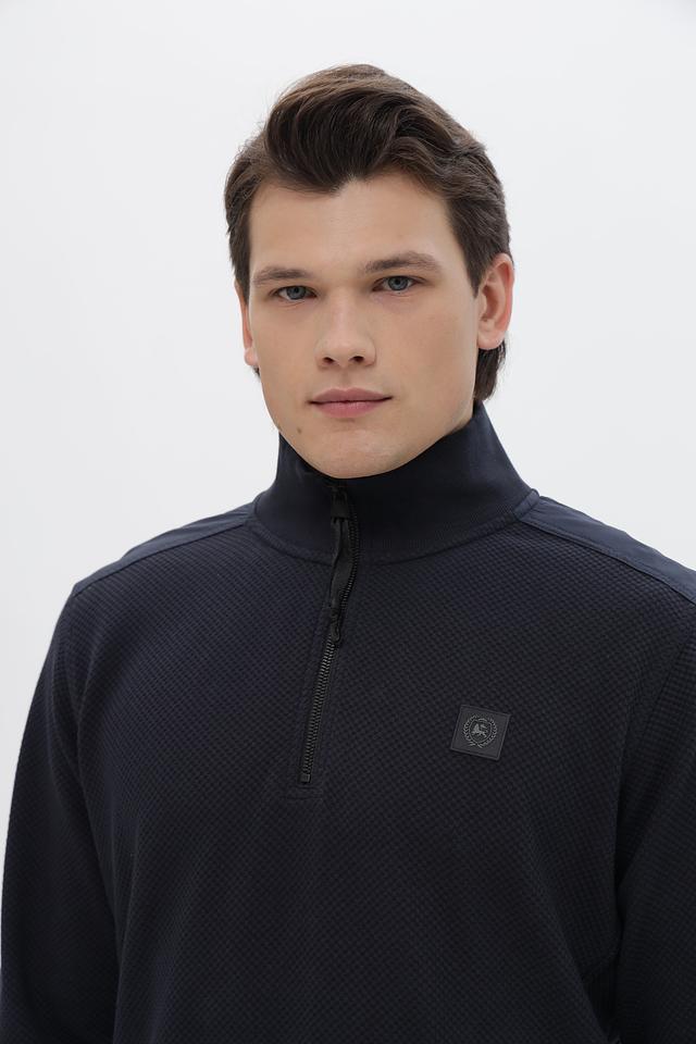 Джемпер отличается оригинальной текстурой в виде мелкой ячеистой сетки, которая придает изделию особый шарм. Короткая молния на горловине позволяет регулировать степень открытости выреза. На груди расположен небольшой логотип бренда.