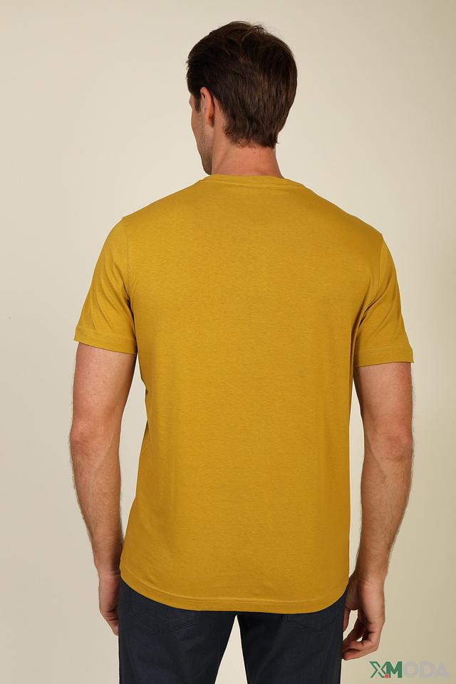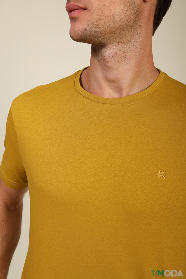 Цвет футболки – насыщенный горчичный, который отлично сочетается с различными оттенками и стилями одежды. На груди расположена небольшая вышивка с логотипом бренда, добавляющая футболке индивидуальности.