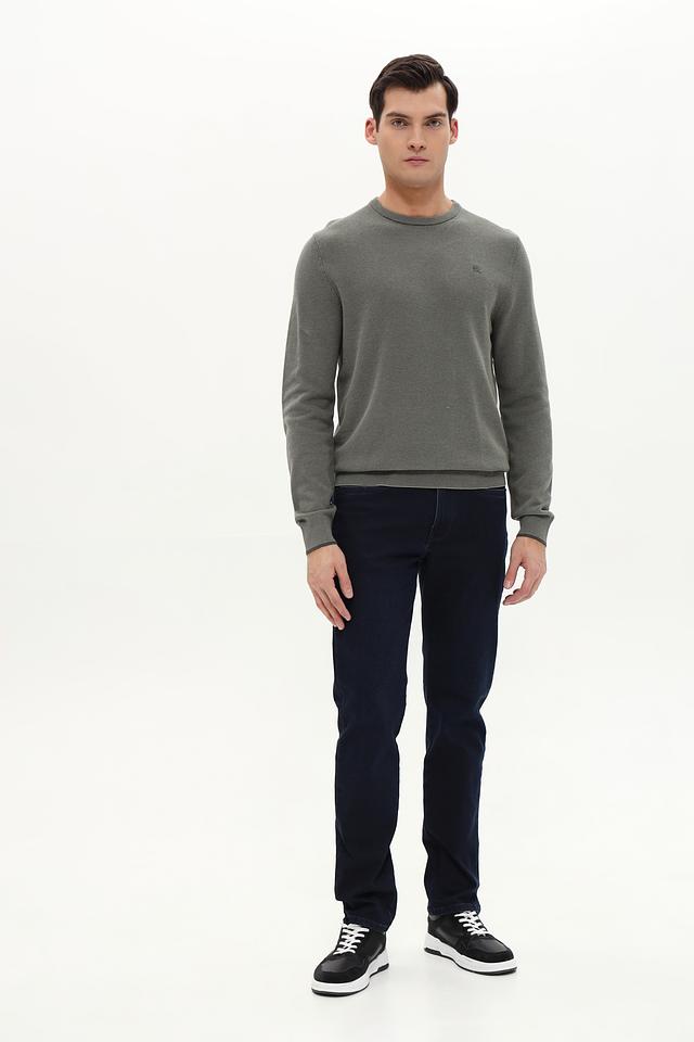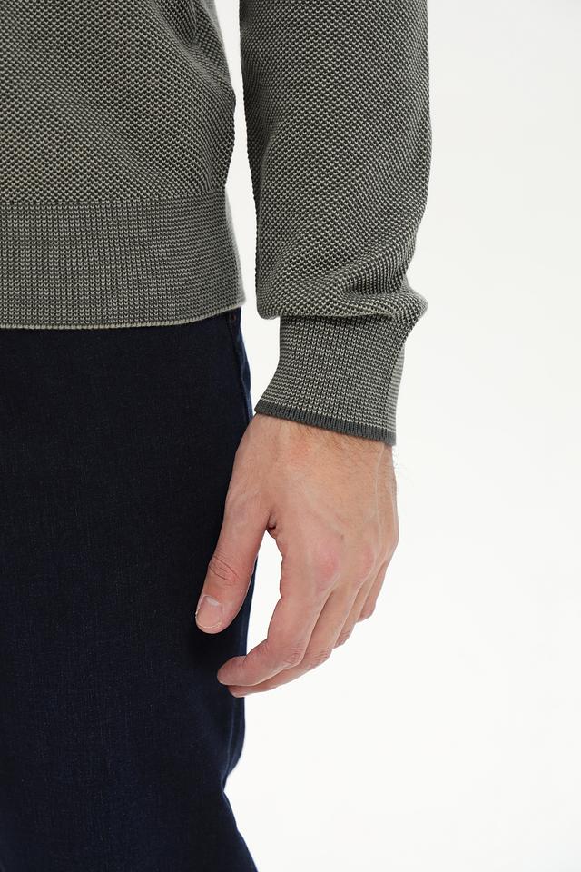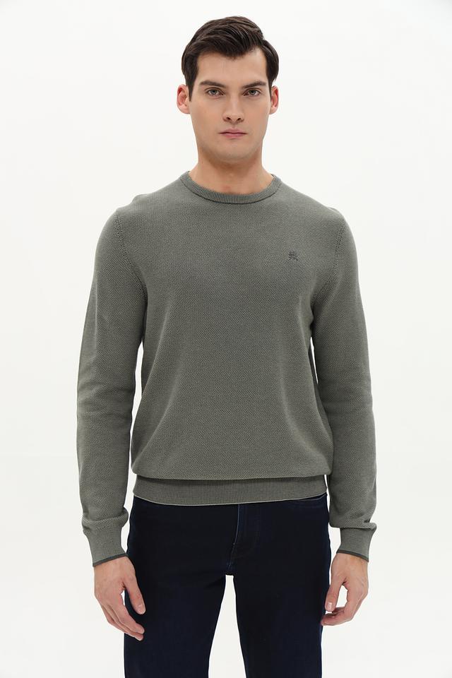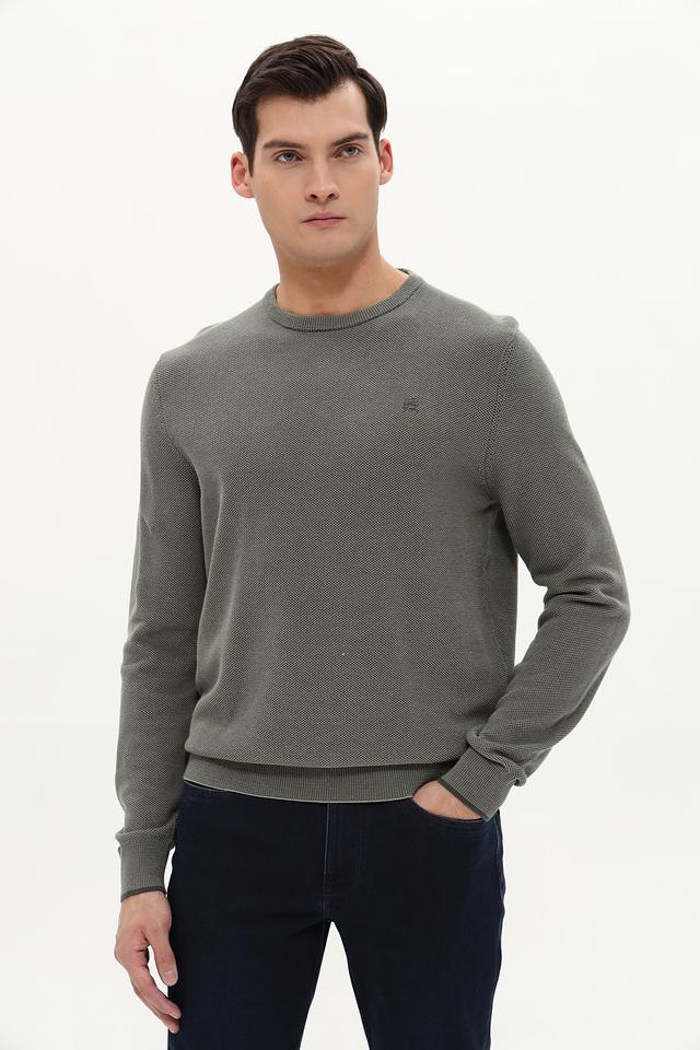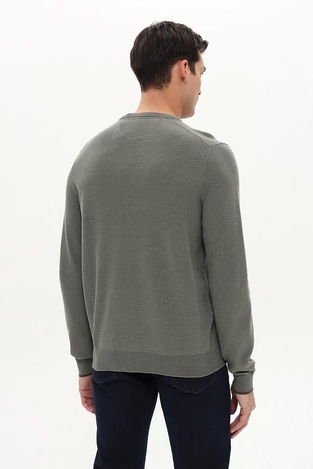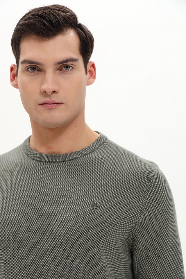 Джемпер имеет спокойный хаки цвет и фактурную вязку, которая придает ему особый шарм. Классический крой с круглым вырезом горловины делает его универсальным для создания различных образов – от повседневных до более формальных.