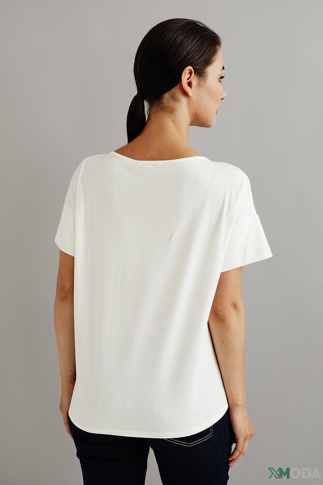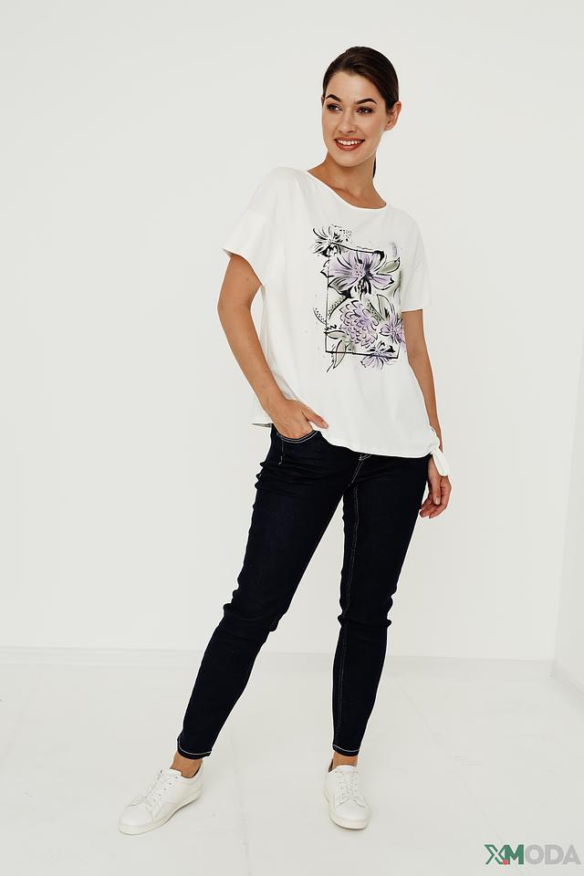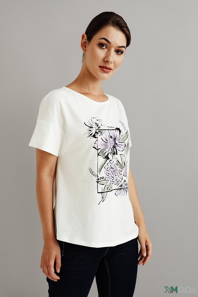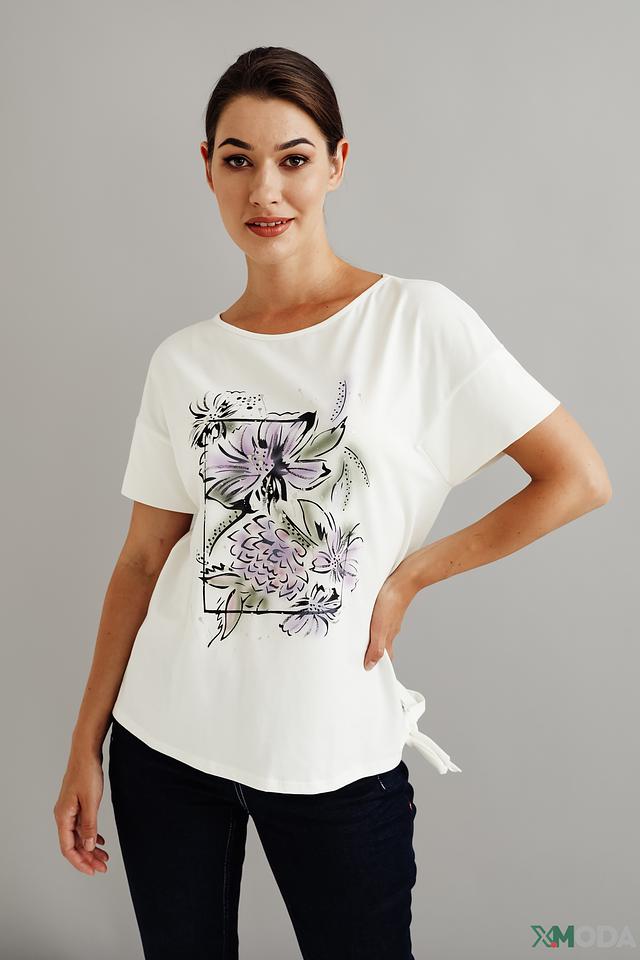 Основной цвет футболки – белый, что делает ее универсальной и легко сочетаемой с другими элементами одежды. Главная особенность модели – яркий и стильный цветочный принт, выполненный в нежных лиловых и зеленых оттенках. Принт придает футболке индивидуальность и женственность.