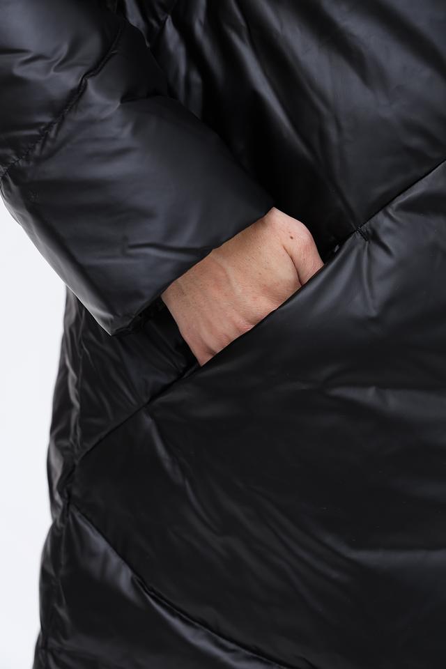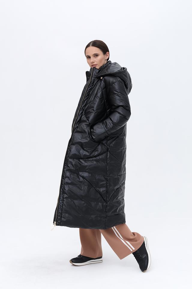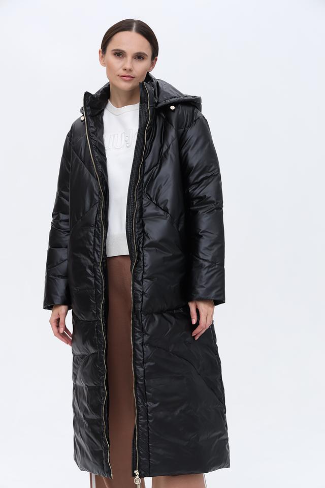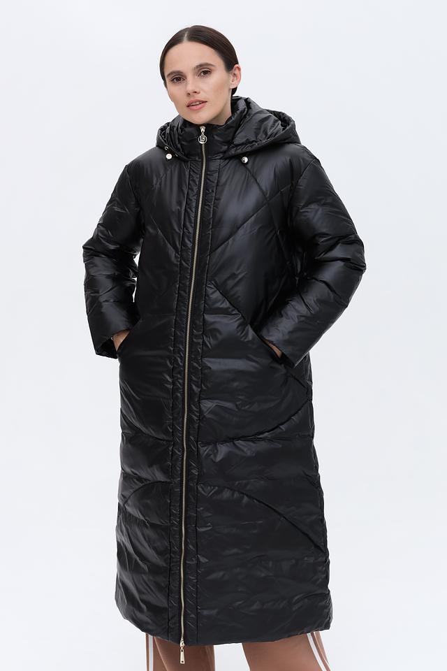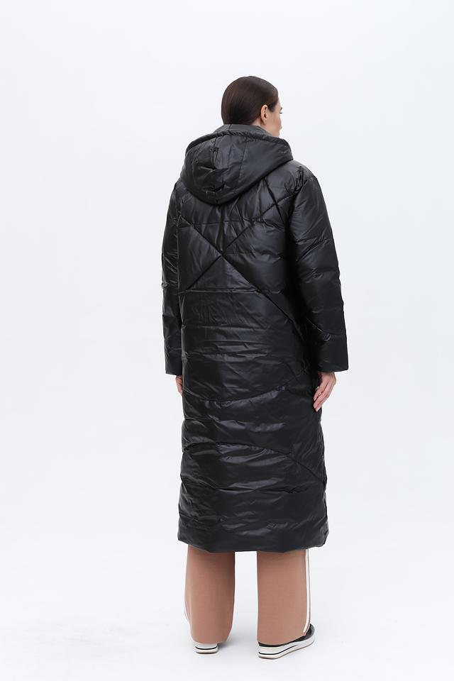Пальто имеет удлиненный силуэт и стеганую фактуру, что обеспечивает отличную теплоизоляцию и придает образу современный вид. Капюшон добавляет функциональности и защищает от непогоды.