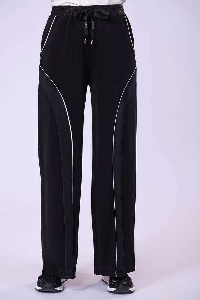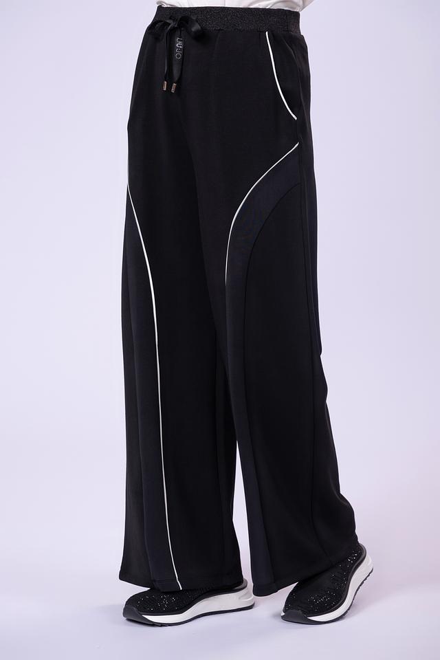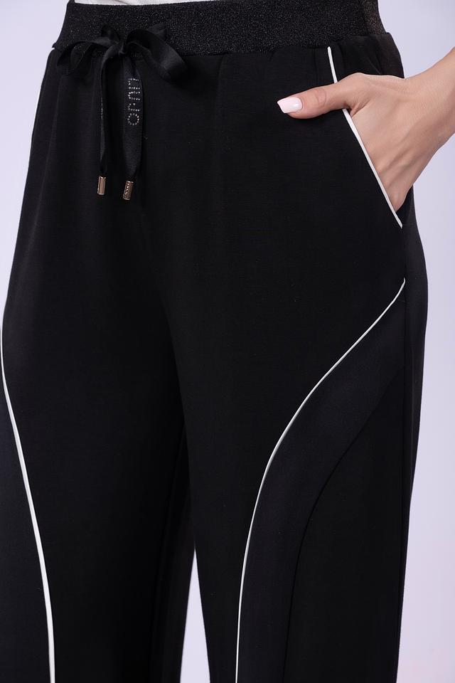 Чёрные брюки Liu-Jo — это стильное и комфортное решение для повседневного гардероба. Модель выполнена из мягкой ткани с добавлением модала и эластана, а декоративные полосы придают образу спортивный шик. Состав: полиэстер 48%, модал 48%, эластан 4%