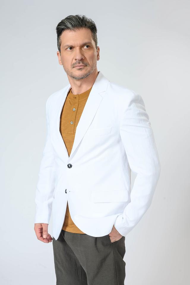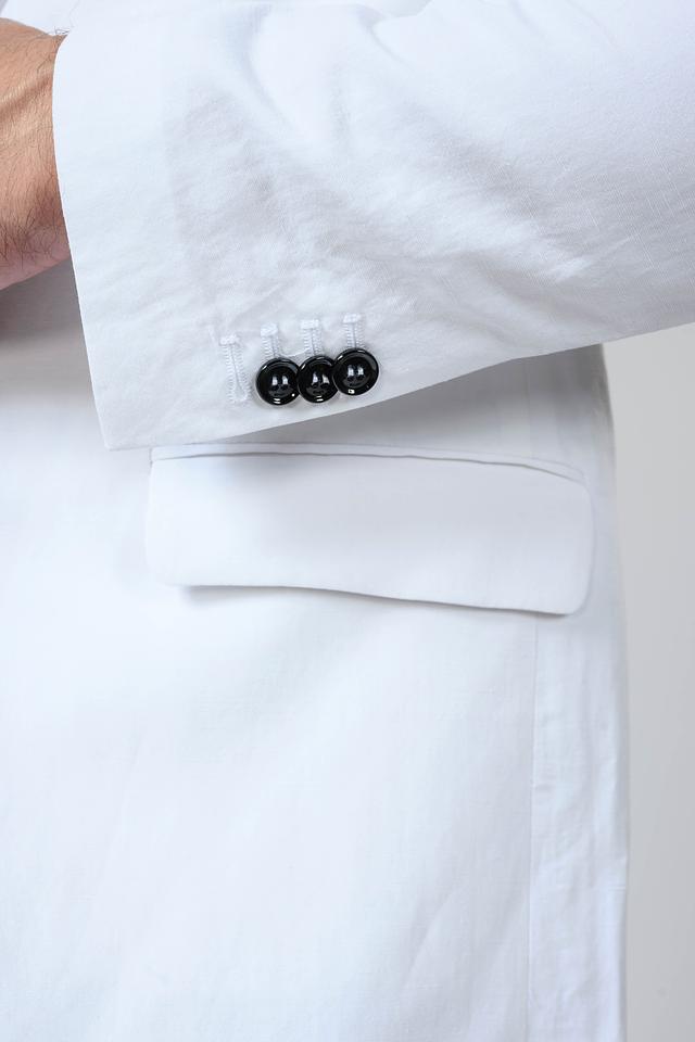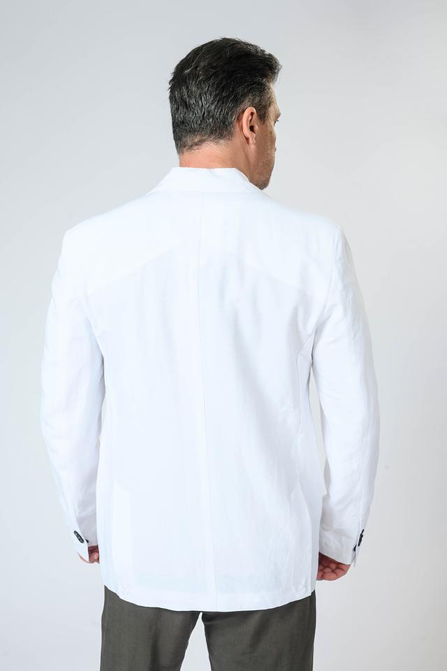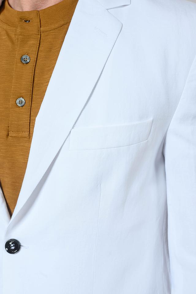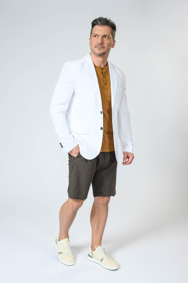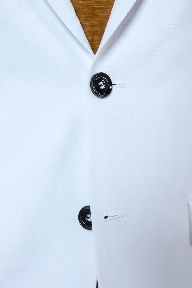 Состав пиджака – 65% вискоза и 35% лен, что обеспечивает комфорт в носке и воздухопроницаемость. Этот пиджак идеально подойдет для теплых дней и вечеров. Он легко сочетается с различными брюками и рубашками, позволяя создавать разнообразные стильные комплекты.
