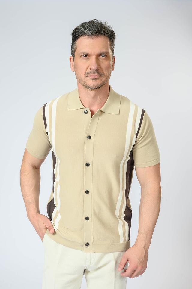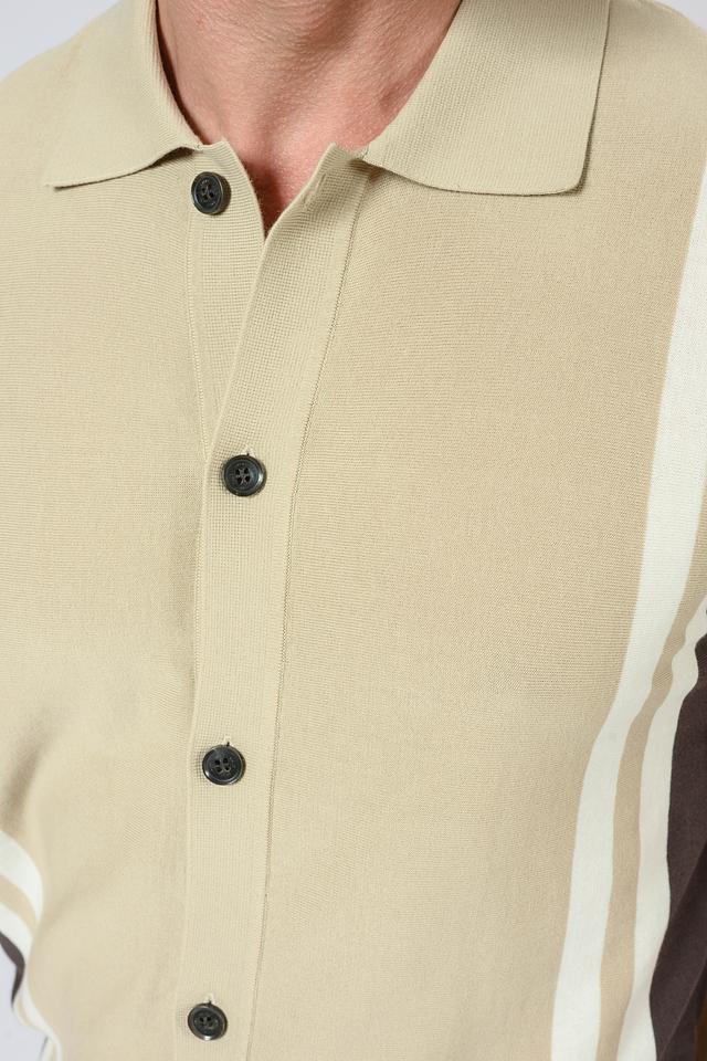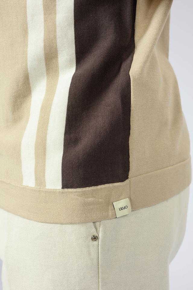 Мужской джемпер Liu-Jo бежевого цвета с коротким рукавом и вертикальными полосами. Модель выполнена из 100% хлопка, имеет воротник-поло и застежку на пуговицы. Состав: хлопок 100%