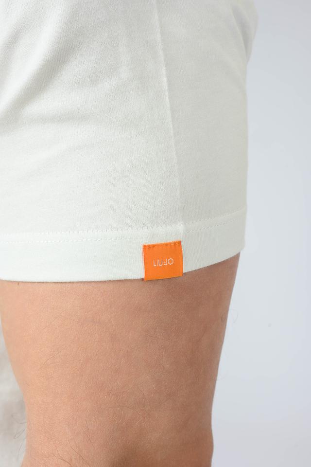 На левом боку, на уровне низа, расположена небольшая оранжевая бирка с логотипом Liu-Jo. Это добавляет узнаваемости и подчеркивает принадлежность к бренду. Футболка отлично сочетается с джинсами, шортами или спортивными брюками, создавая непринужденный и стильный образ.