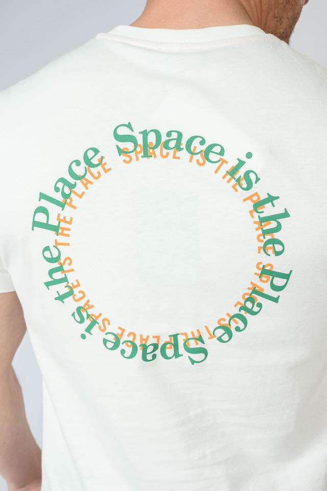 Футболка имеет классический крой и круглый вырез горловины. Передняя часть украшена небольшим принтом с логотипом бренда и надписью, а задняя – крупным графическим рисунком. Такой дизайн придает футболке индивидуальность и современный вид.