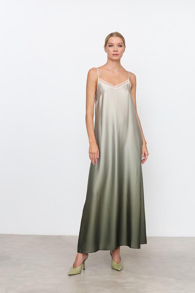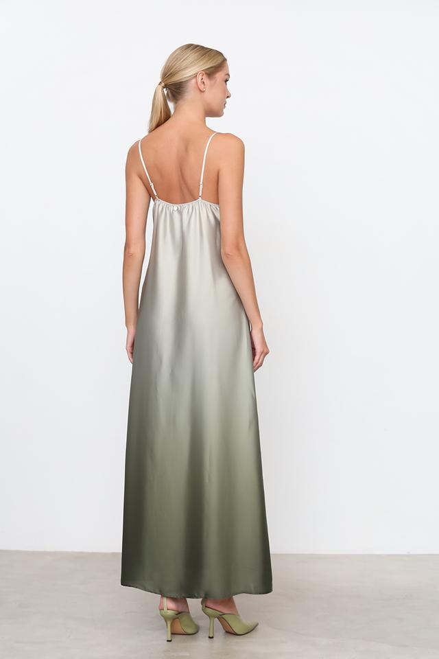Модель имеет прямой, свободный крой, который не сковывает движения и подходит для разных типов фигур. Платье выполнено в технике омбре, с плавным переходом от светло-серого оттенка в верхней части к хаки в нижней.