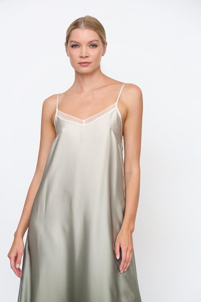 Тонкие бретели и V-образный вырез подчеркивают женственность силуэта. Длина платья – макси. Отделка горловины выполнена из нежной кружевной ткани, добавляя изысканности образу.