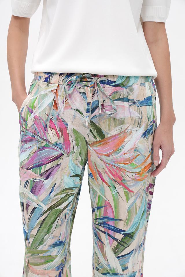 Женские брюки Gerry Weber бежевого цвета с ярким тропическим принтом. Изготовлены из 100% льна, обеспечивающего комфорт и воздухопроницаемость в жаркую погоду. Подчеркнуто расслабленный крой. Состав: лен 100%