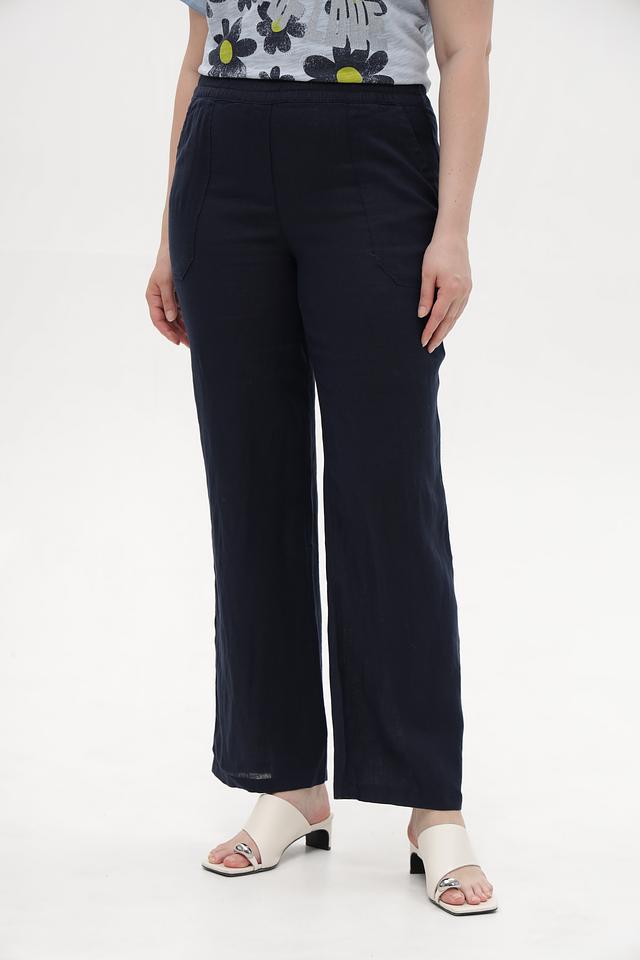 Классический тёмно-синий цвет делает эти брюки универсальными и легко сочетаемыми с различными верхами. Прямой крой обеспечивает свободу движений, а эластичный пояс гарантирует удобную посадку.