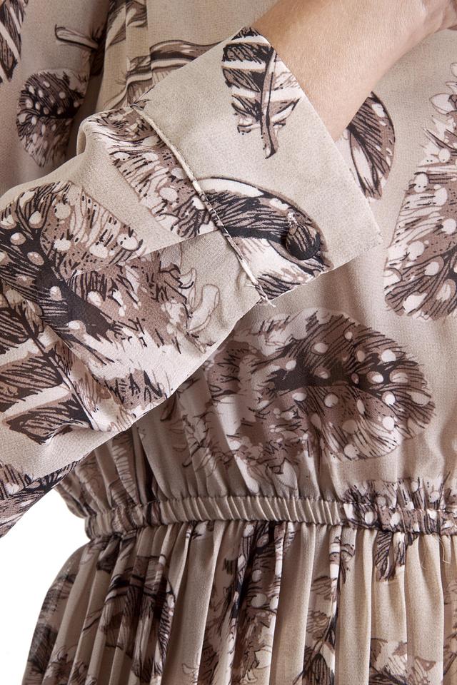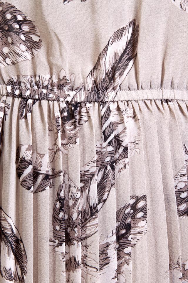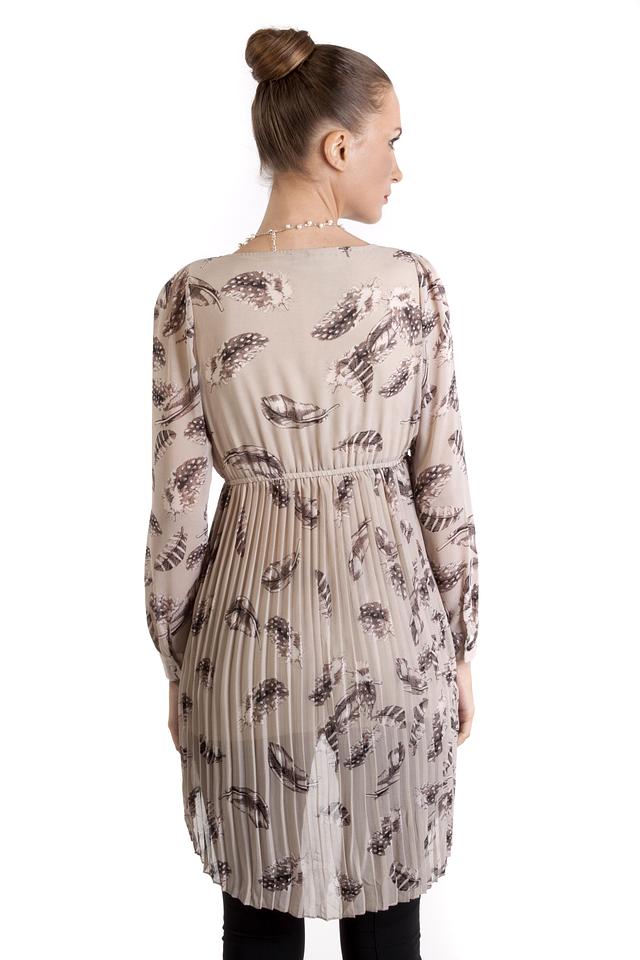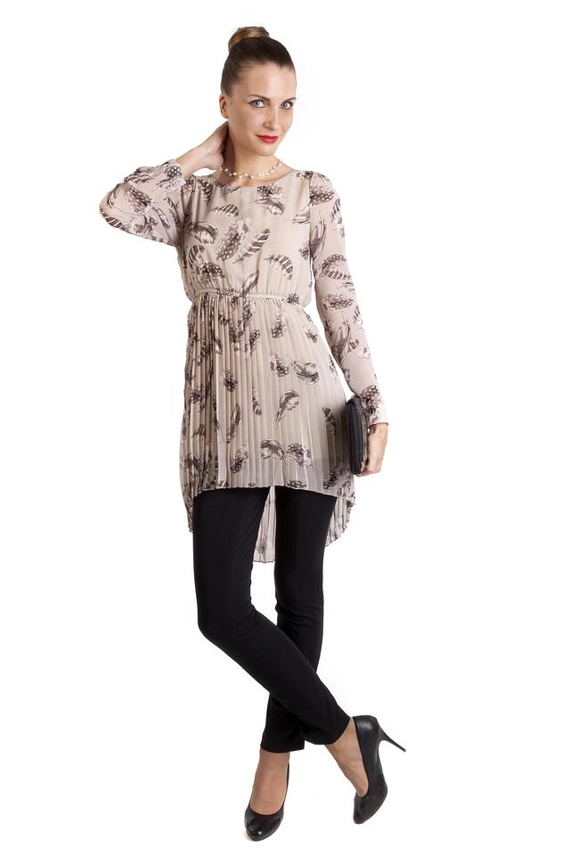 - Дизайн: Блуза украшена нежным принтом в виде перьев, который добавляет изысканности и стиля. Фасон с плиссированной юбкой и эластичной вставкой на талии создает элегантный силуэт.