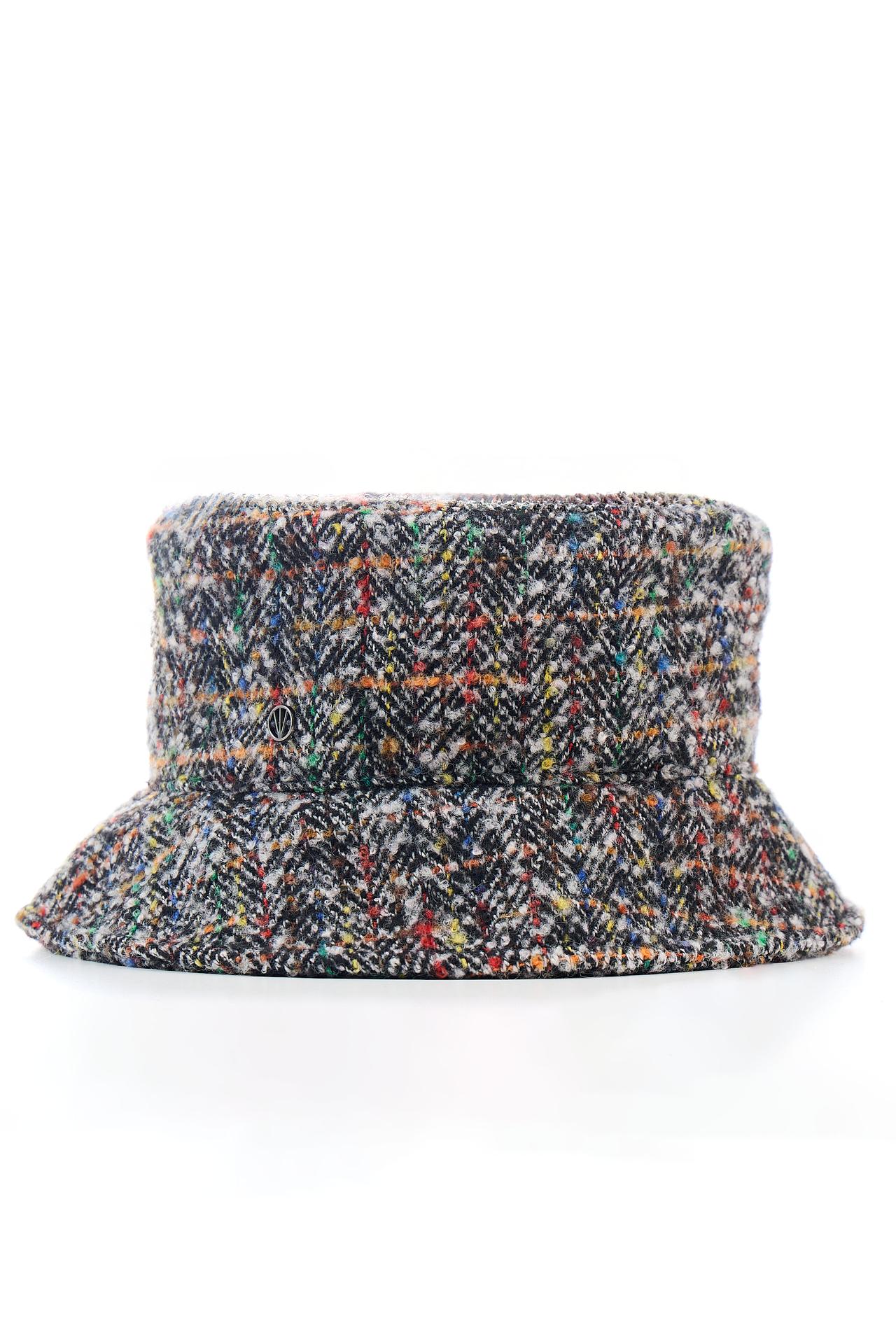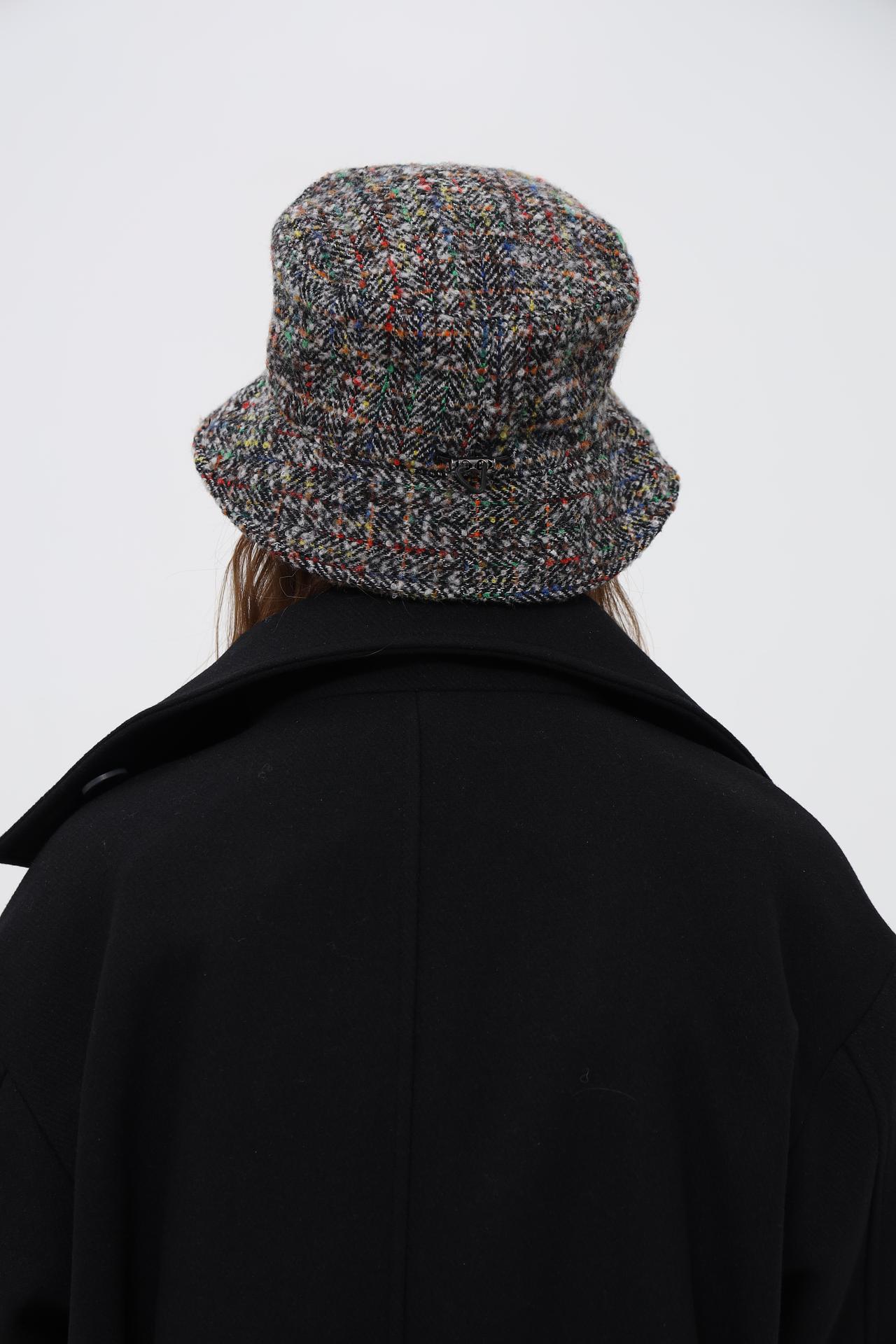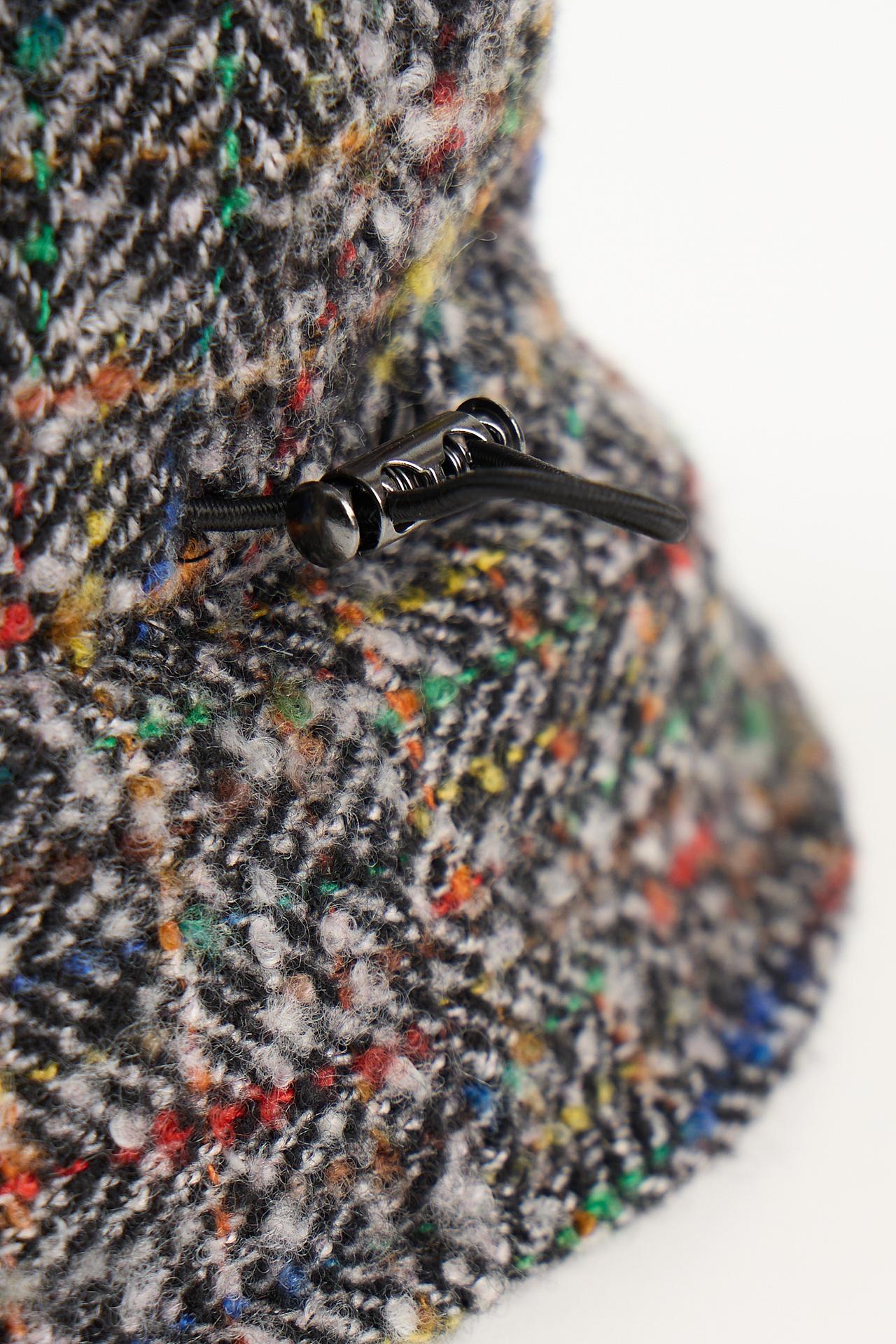 - Дизайн: Классическая форма шляпы дополнена интересным принтом «ёлочка» с вкраплениями разноцветных нитей. Это придает изделию уникальность и выразительность.