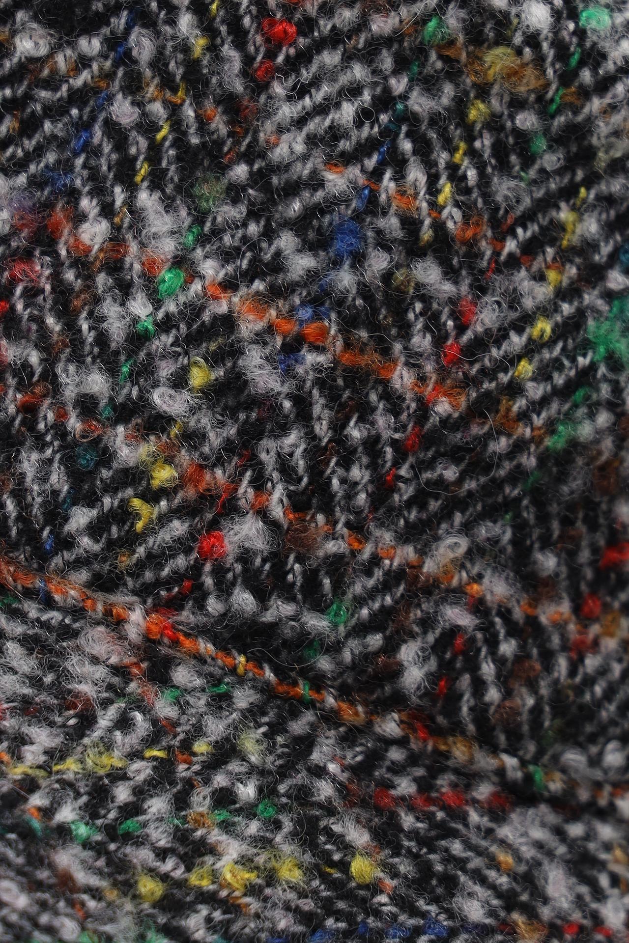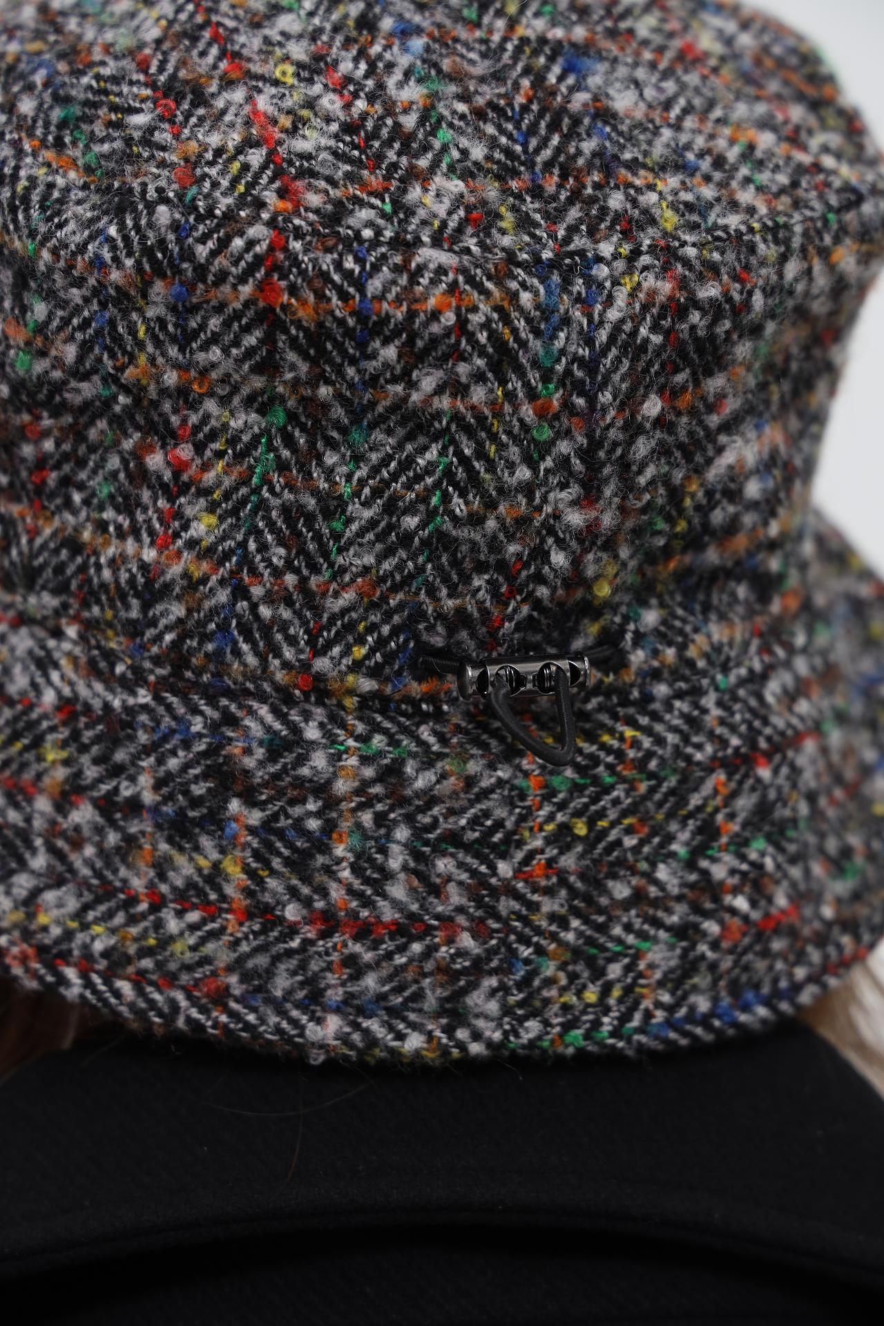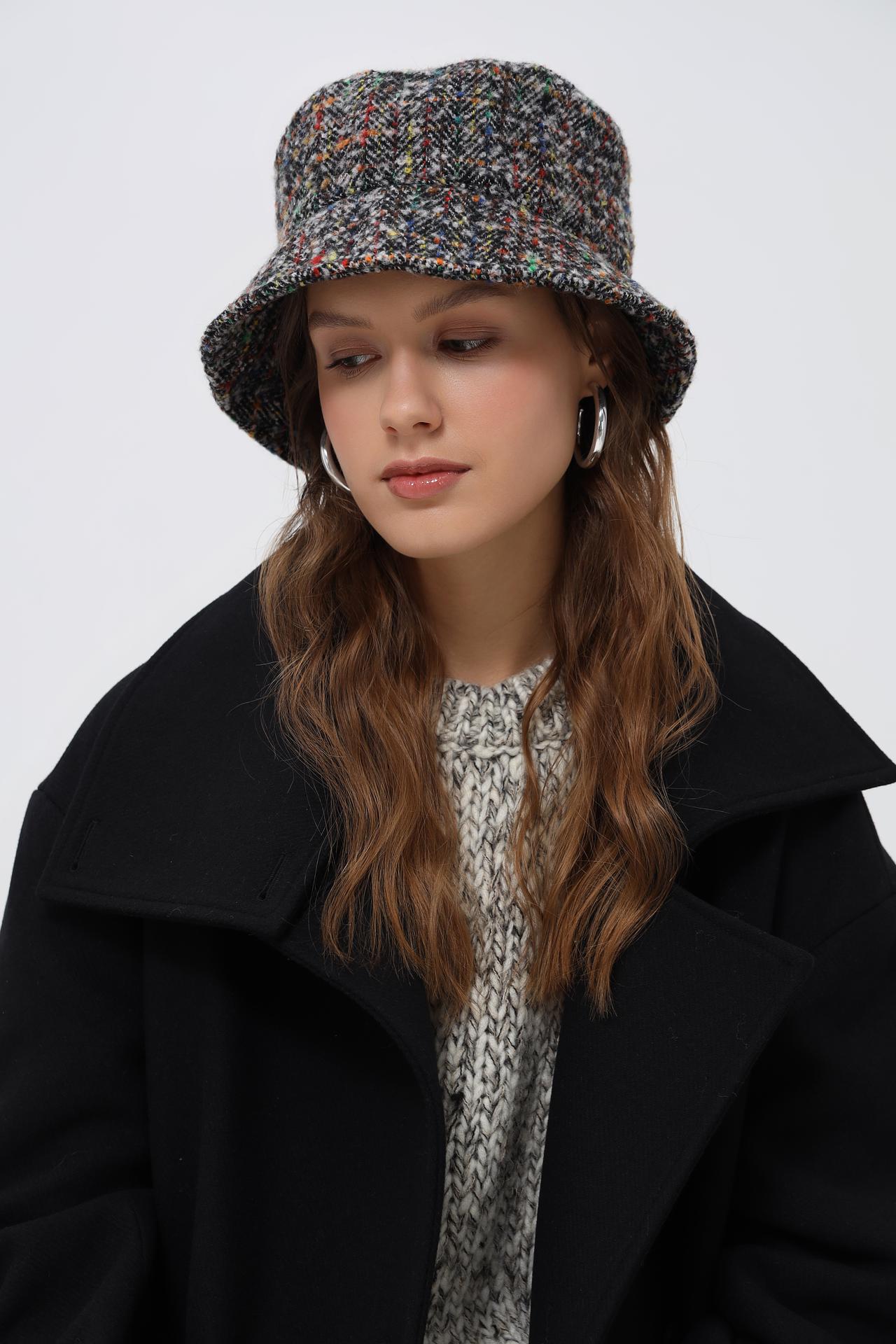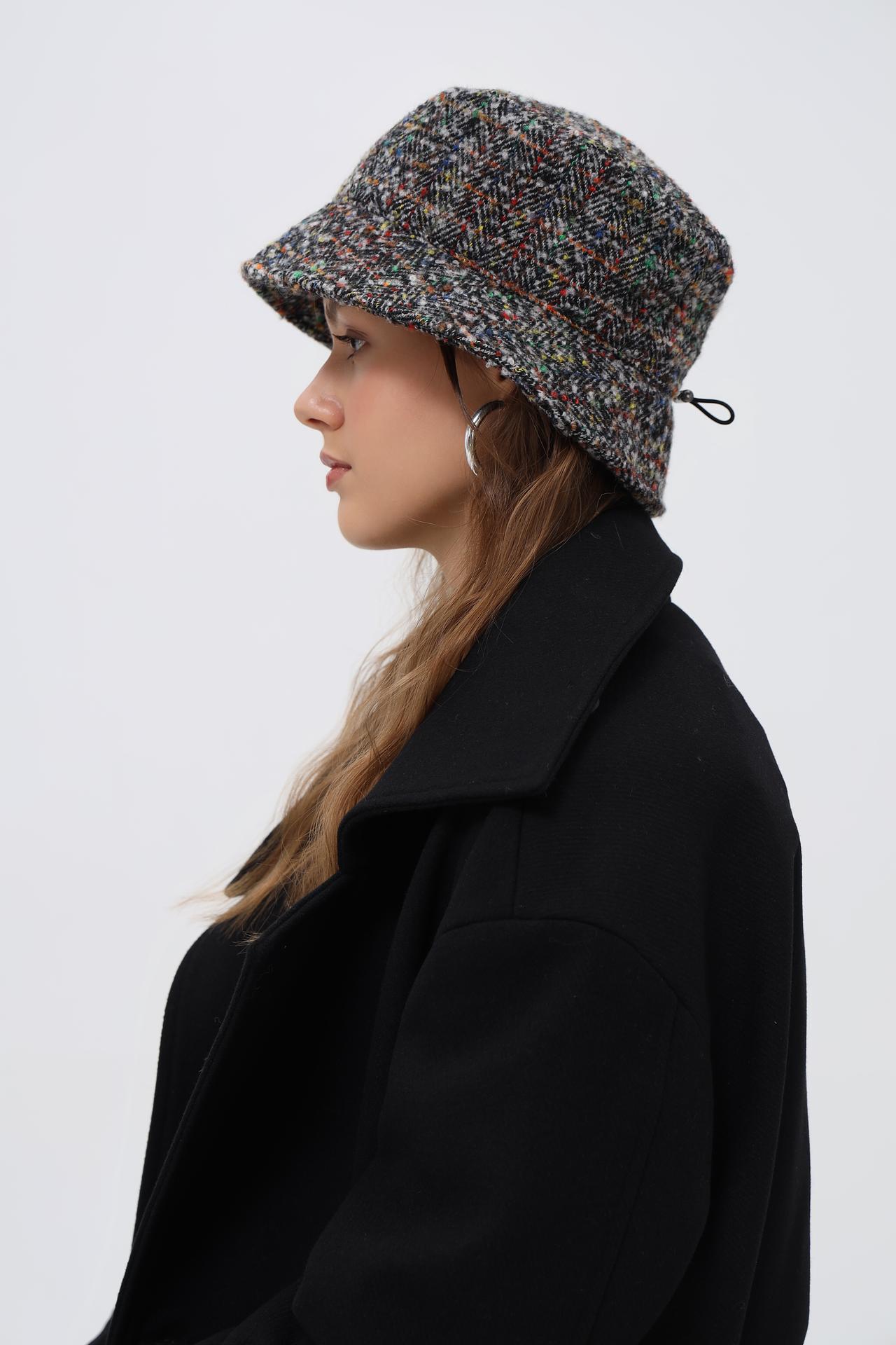 - Дизайн: Классическая форма шляпы дополнена интересным принтом «ёлочка» с вкраплениями разноцветных нитей. Это придает изделию уникальность и выразительность.