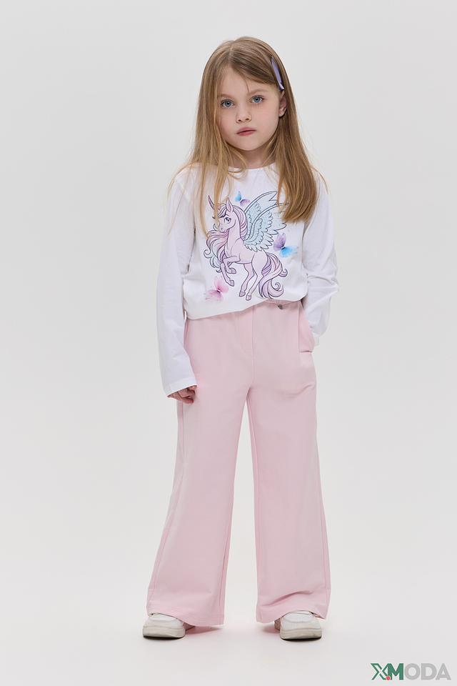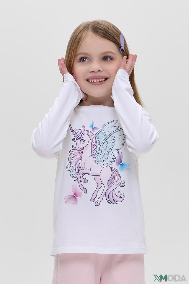 Футболка для девочки украшена ярким и красочным принтом с единорогом, который непременно понравится каждой маленькой моднице. Белый лонгслив идеально сочетается с любым низом, позволяя создавать разнообразные образы.