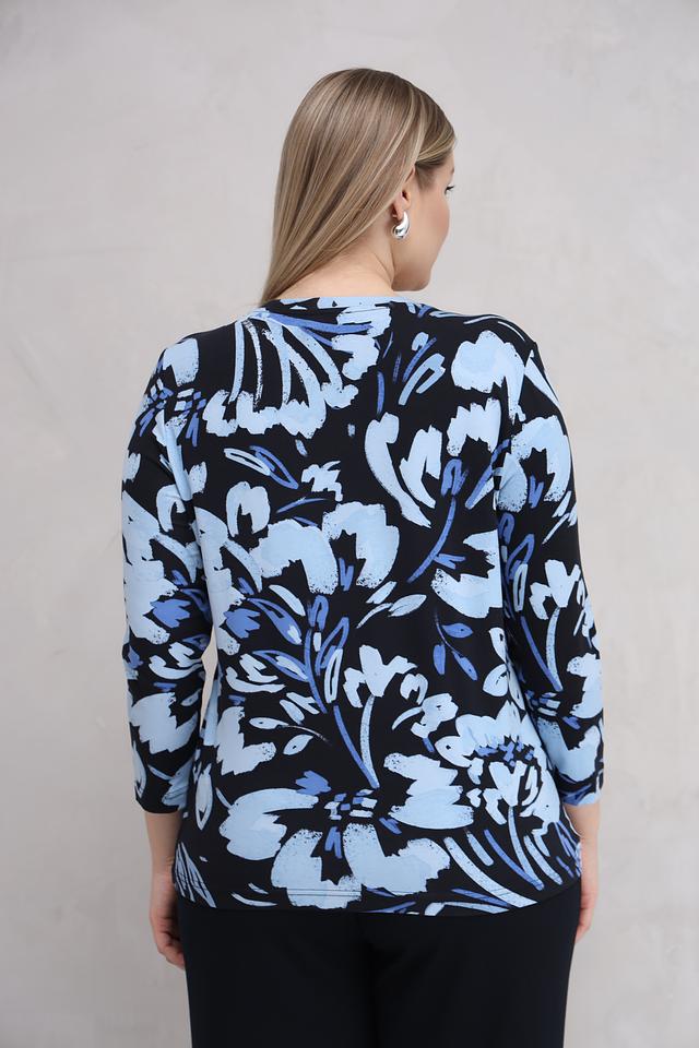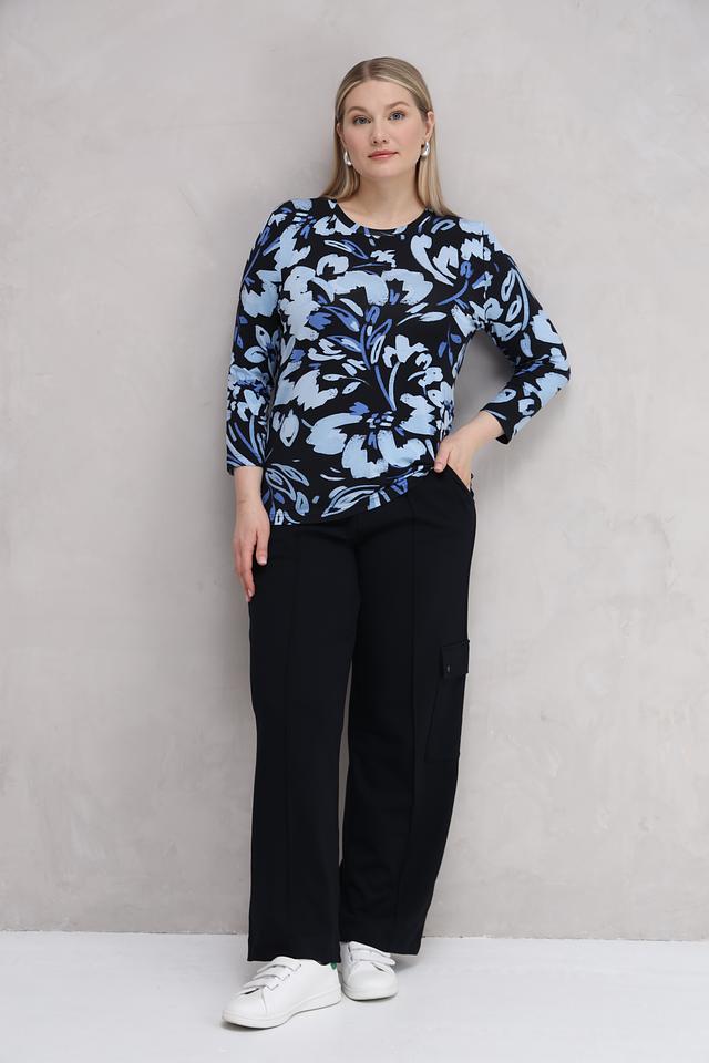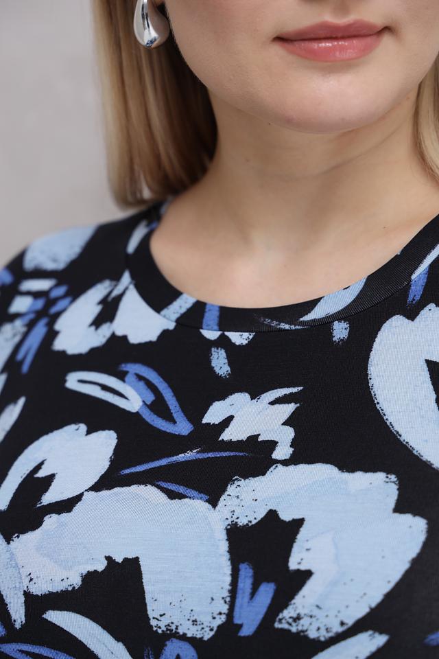Модель имеет длинные рукава и круглый вырез горловины. Особенностью лонгслива является яркий цветочный принт, выполненный в голубых и белых тонах на черном фоне. Принт добавляет образу женственности и легкости.