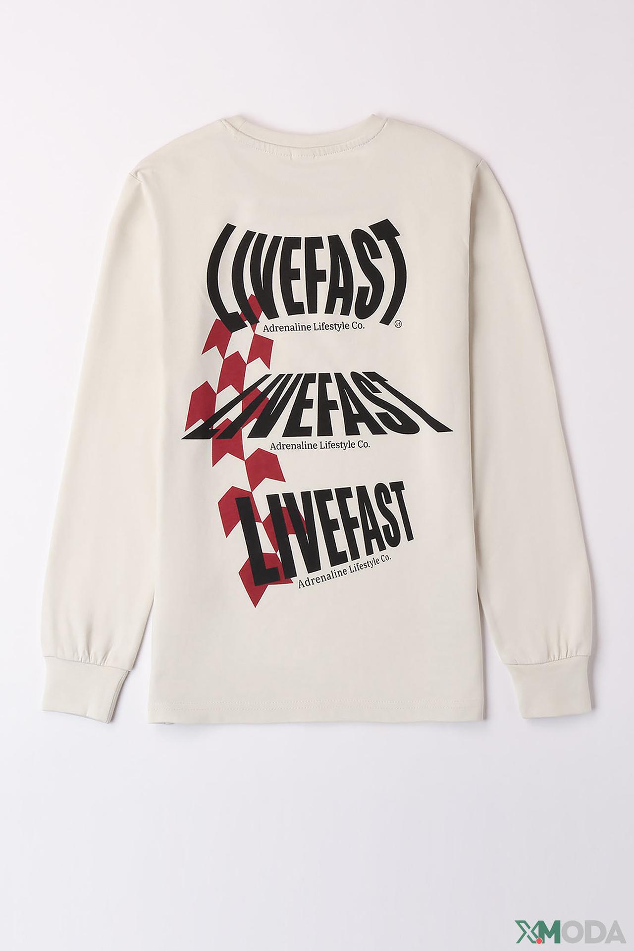 - Дизайн: Модель выполнена в универсальном бежевом цвете и украшена стильным графическим принтом с логотипом спереди и динамичной надписью на спине. Это придает образу современный и энергичный вид, идеально для повседневного детского гардероба.