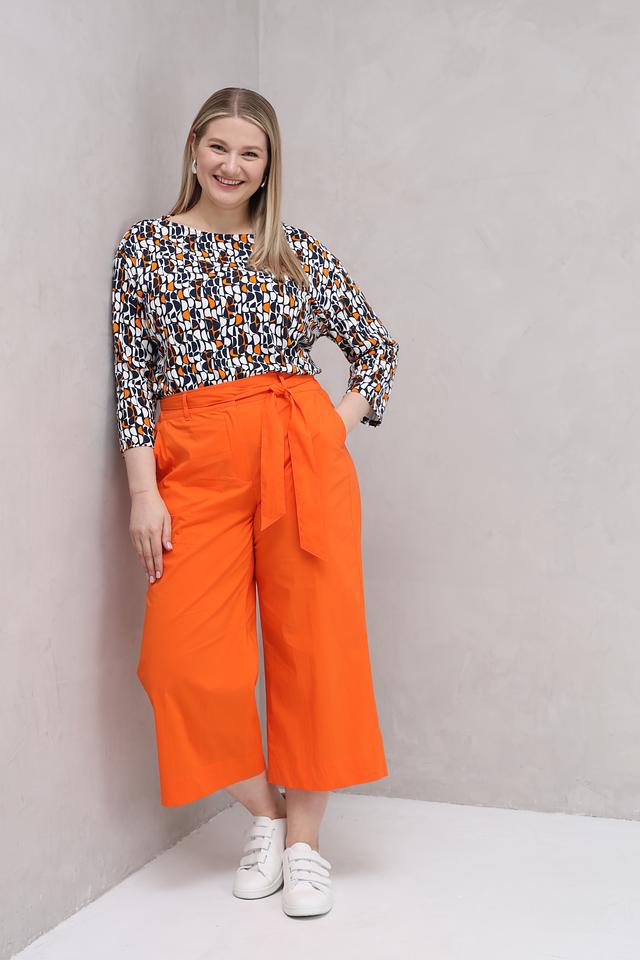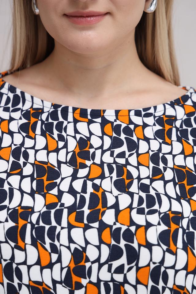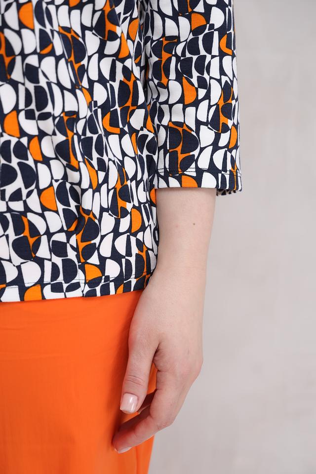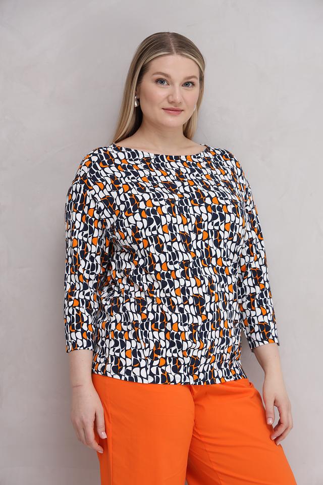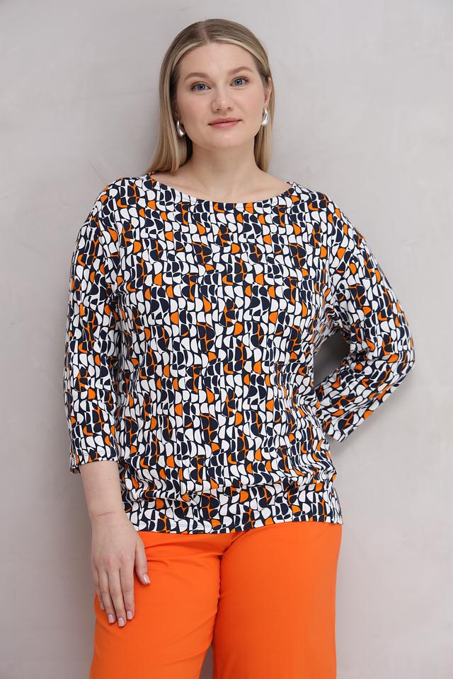 Лонгслив имеет оригинальный принт, выполненный в оранжево-чёрно-белой гамме, который придаёт ему особый шарм и индивидуальность. Вырез горловины – классический, округлый. Длинные рукава делают его идеальным для прохладной погоды.