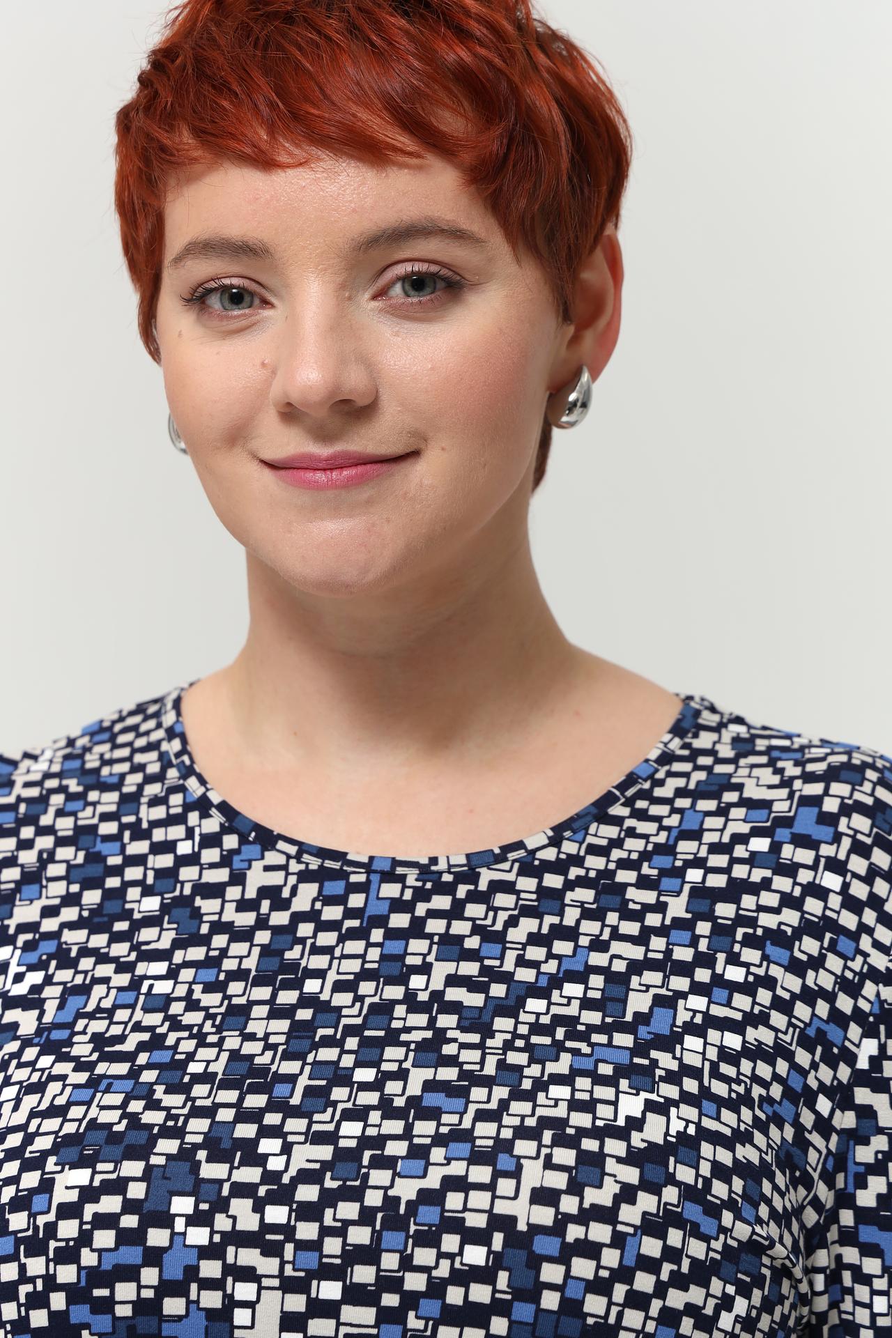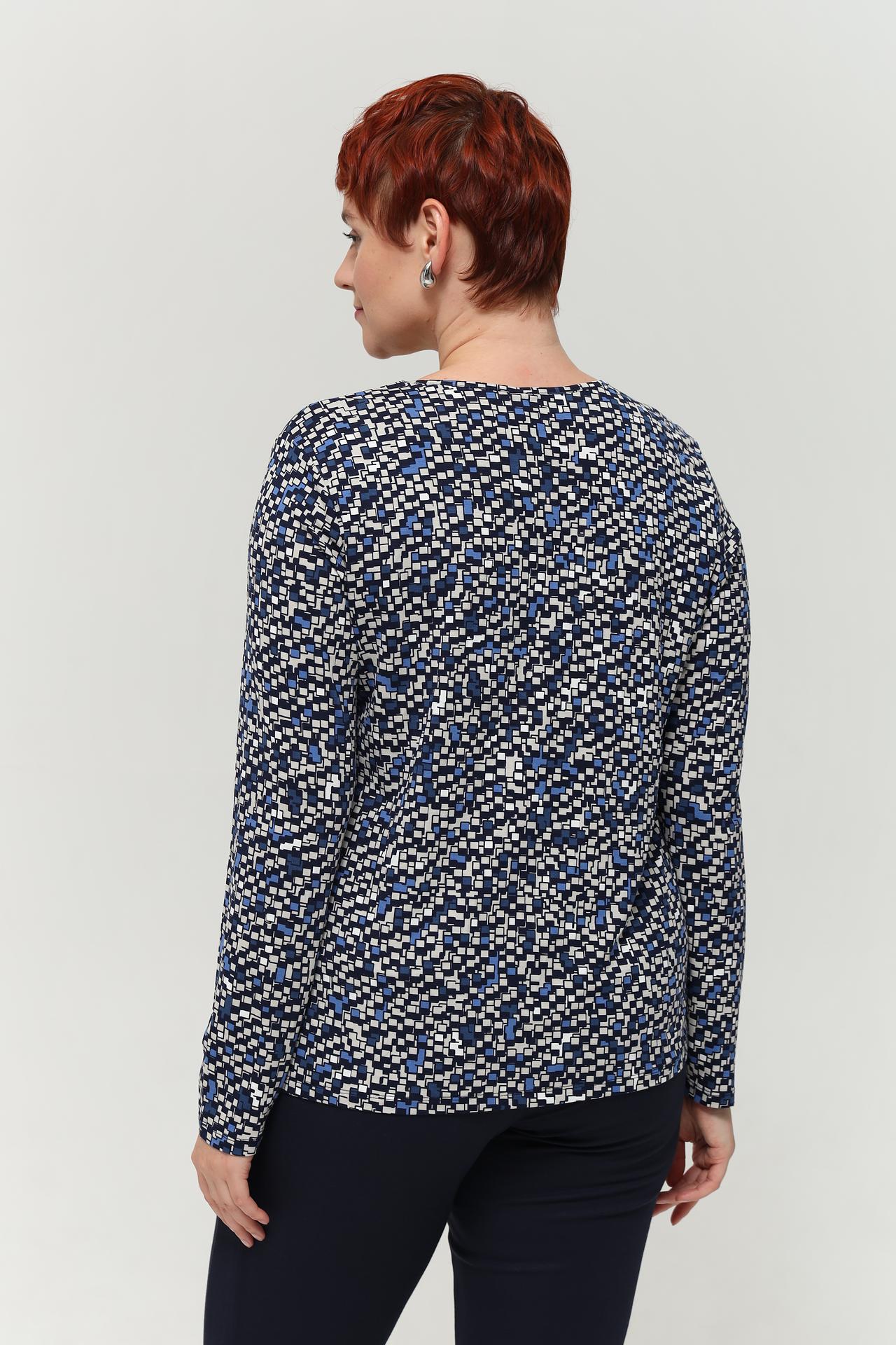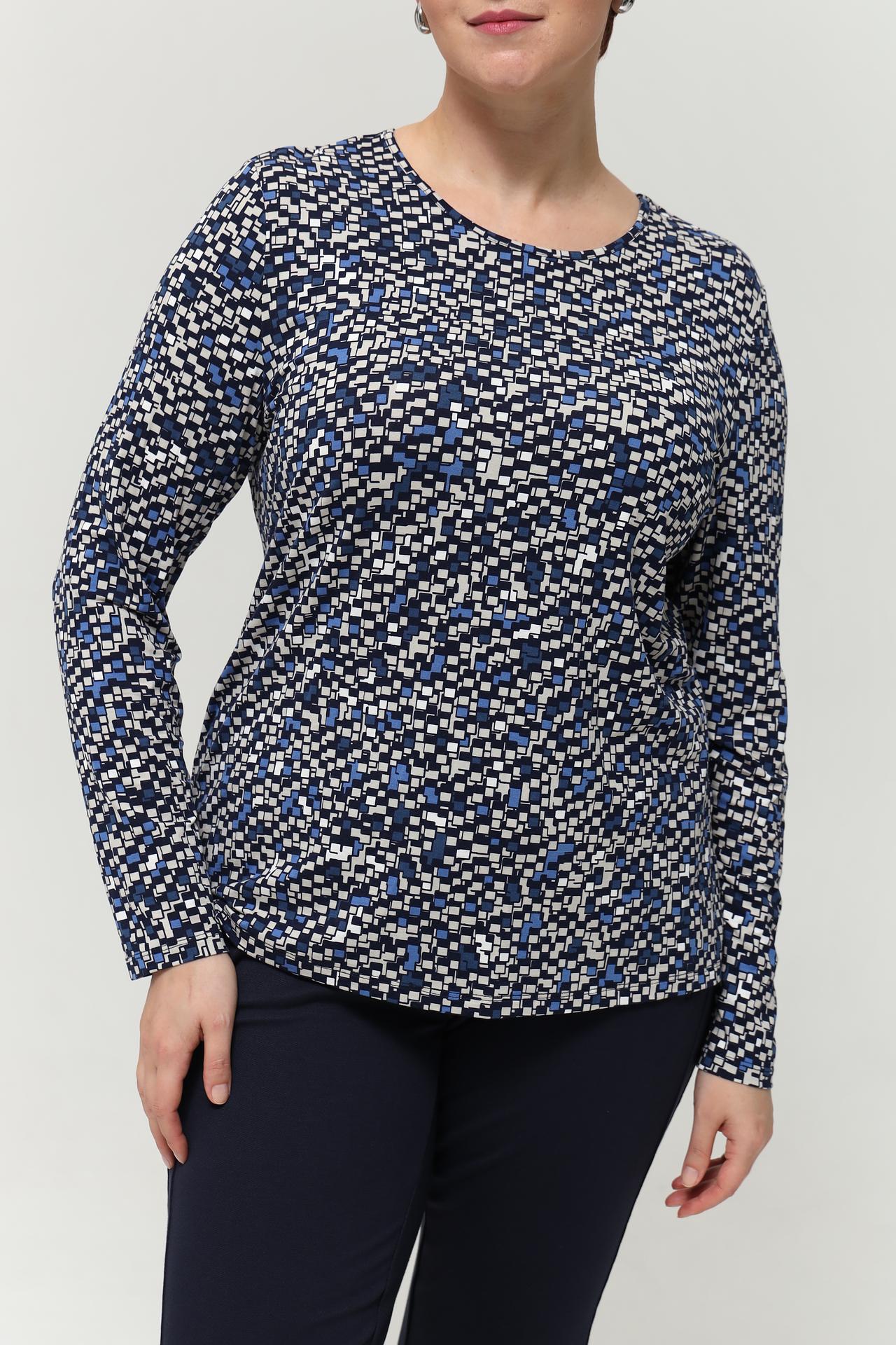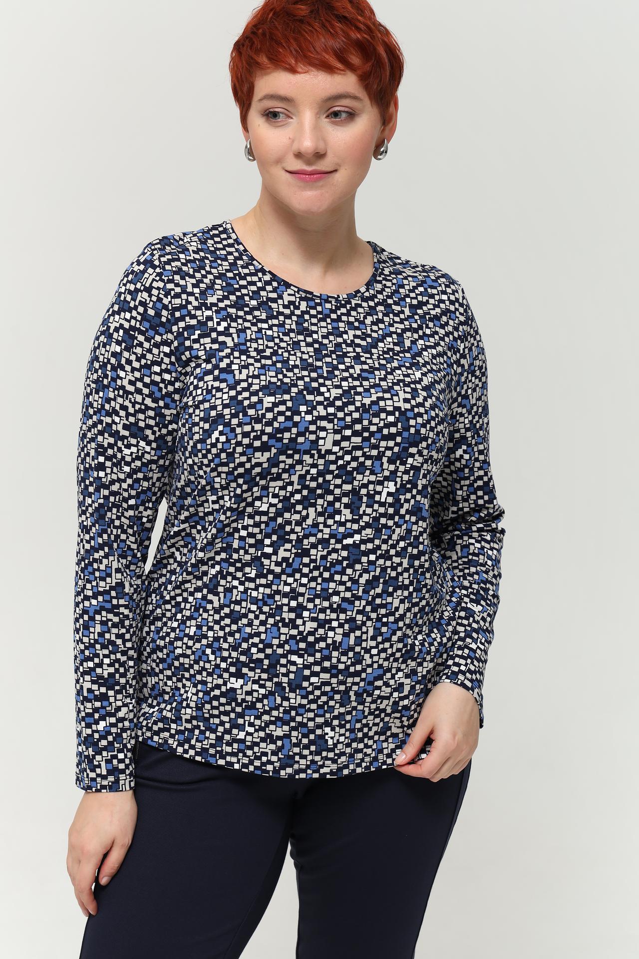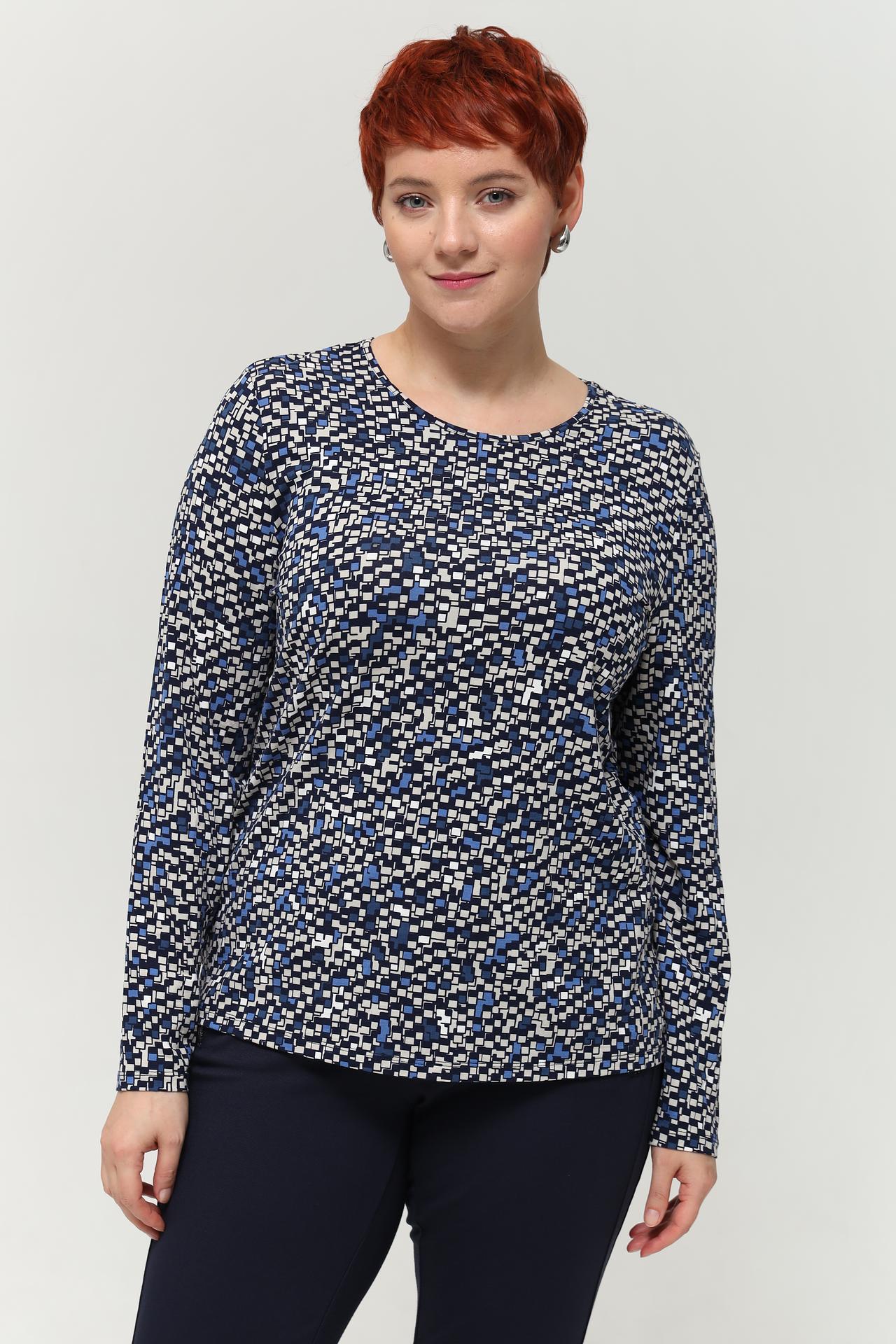 - Стильный дизайн: Яркий геометрический принт в сине-белых тонах придает изделию современный и динамичный вид, легко комбинируется с однотонными брюками или юбками.