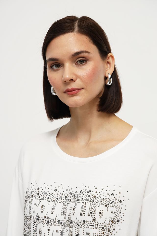 Белый лонгслив от Monari с эффектным принтом в виде надписи, выполненный из мягкой и приятной к телу ткани. Эта модель станет отличным дополнением к вашему повседневному гардеробу, сочетая в себе комфорт и стиль. Состав: вискоза 45%, модал 45%, эластан 10%