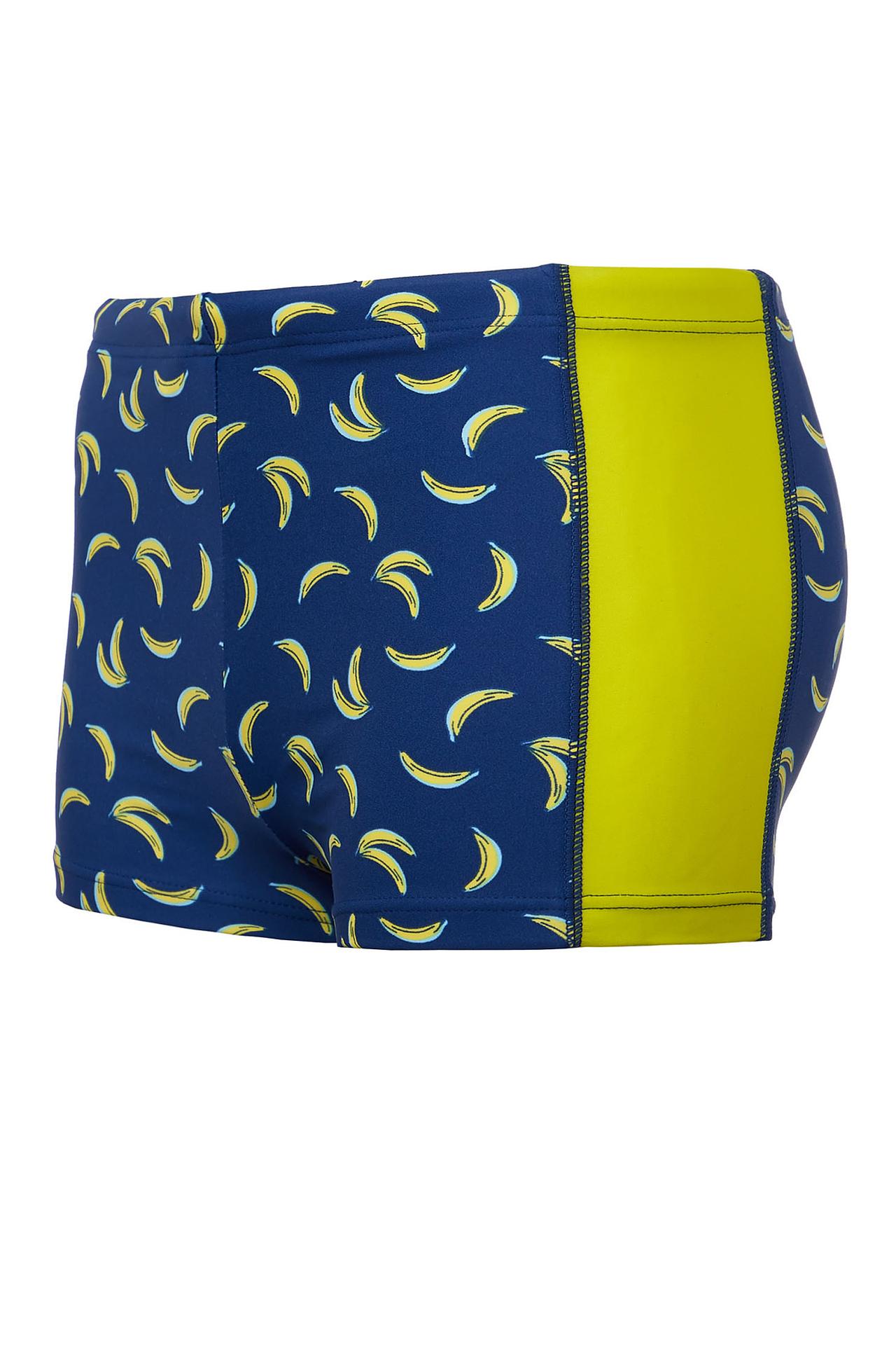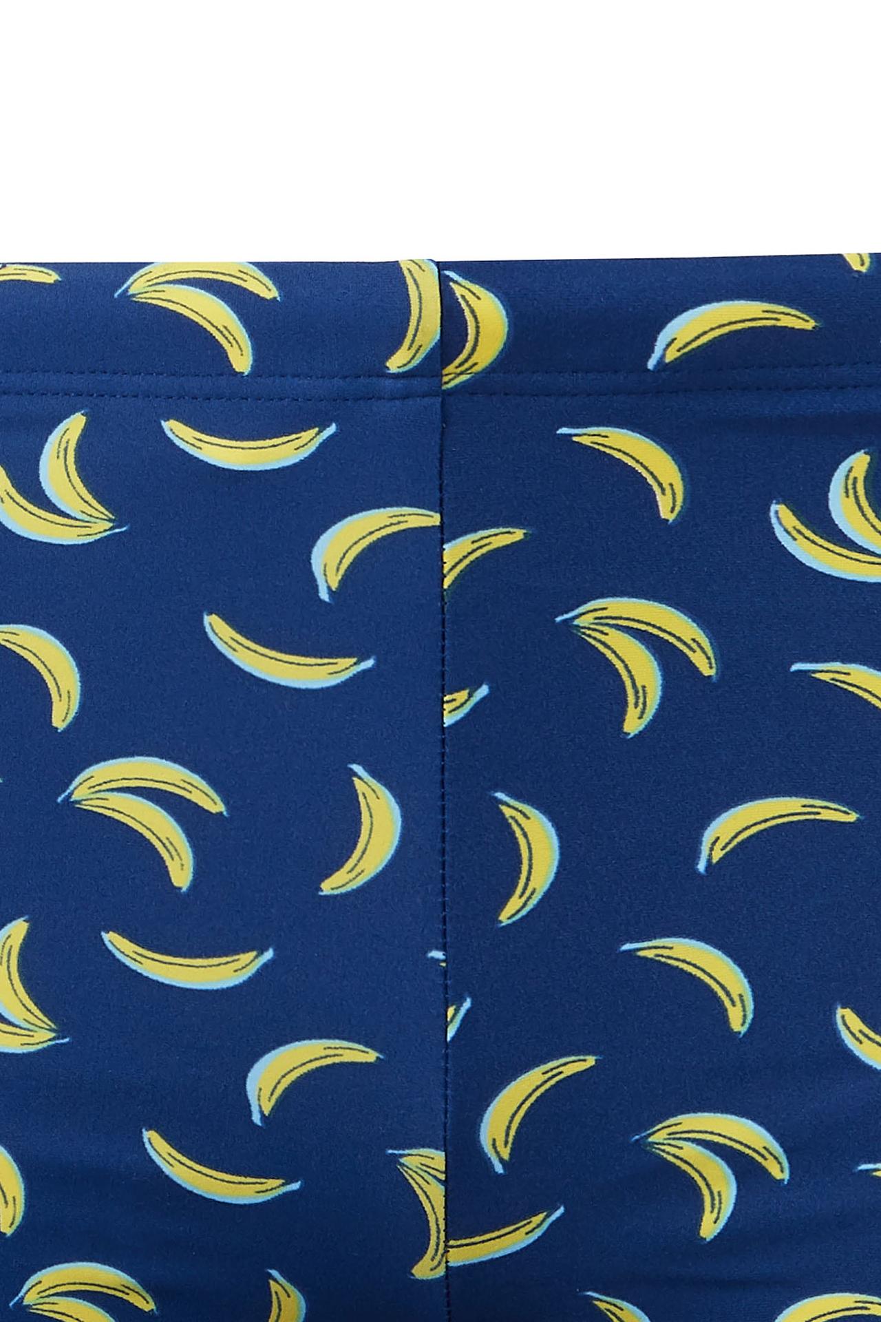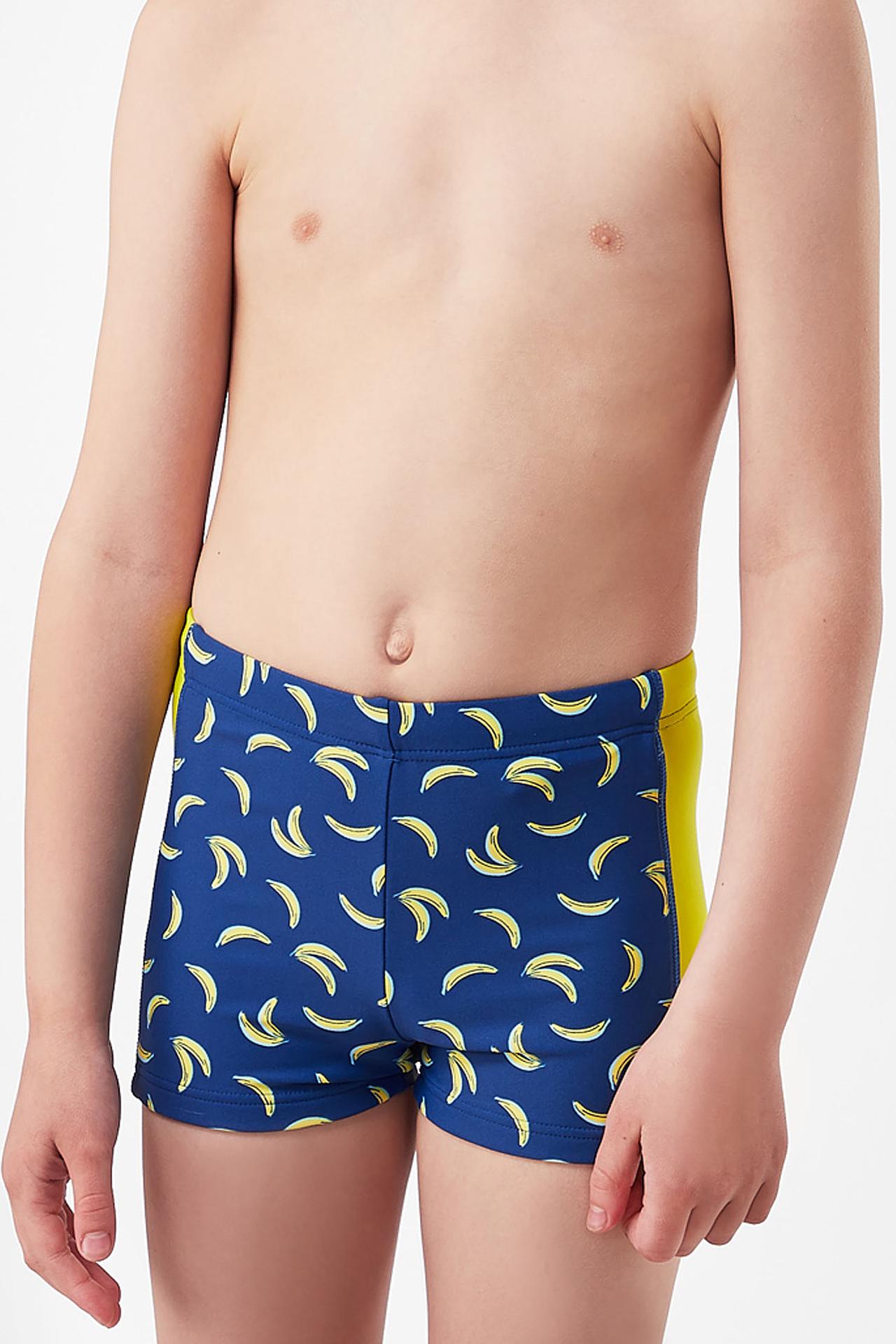 - Стильный дизайн: Яркий синий цвет в сочетании с контрастными жёлтыми бананами и однотонными боковыми вставками делает эти купальные шорты по-настоящему летними и привлекательными. Такой принт обязательно понравится юным модникам.