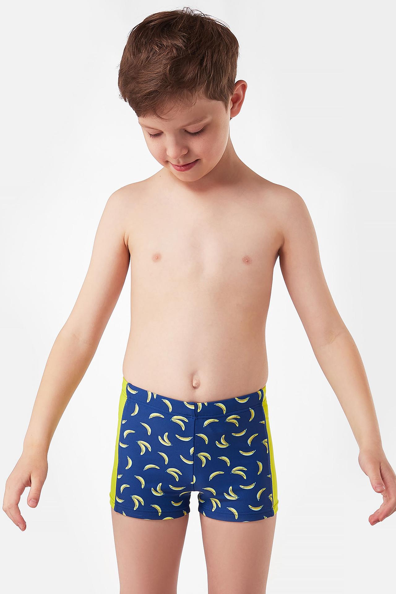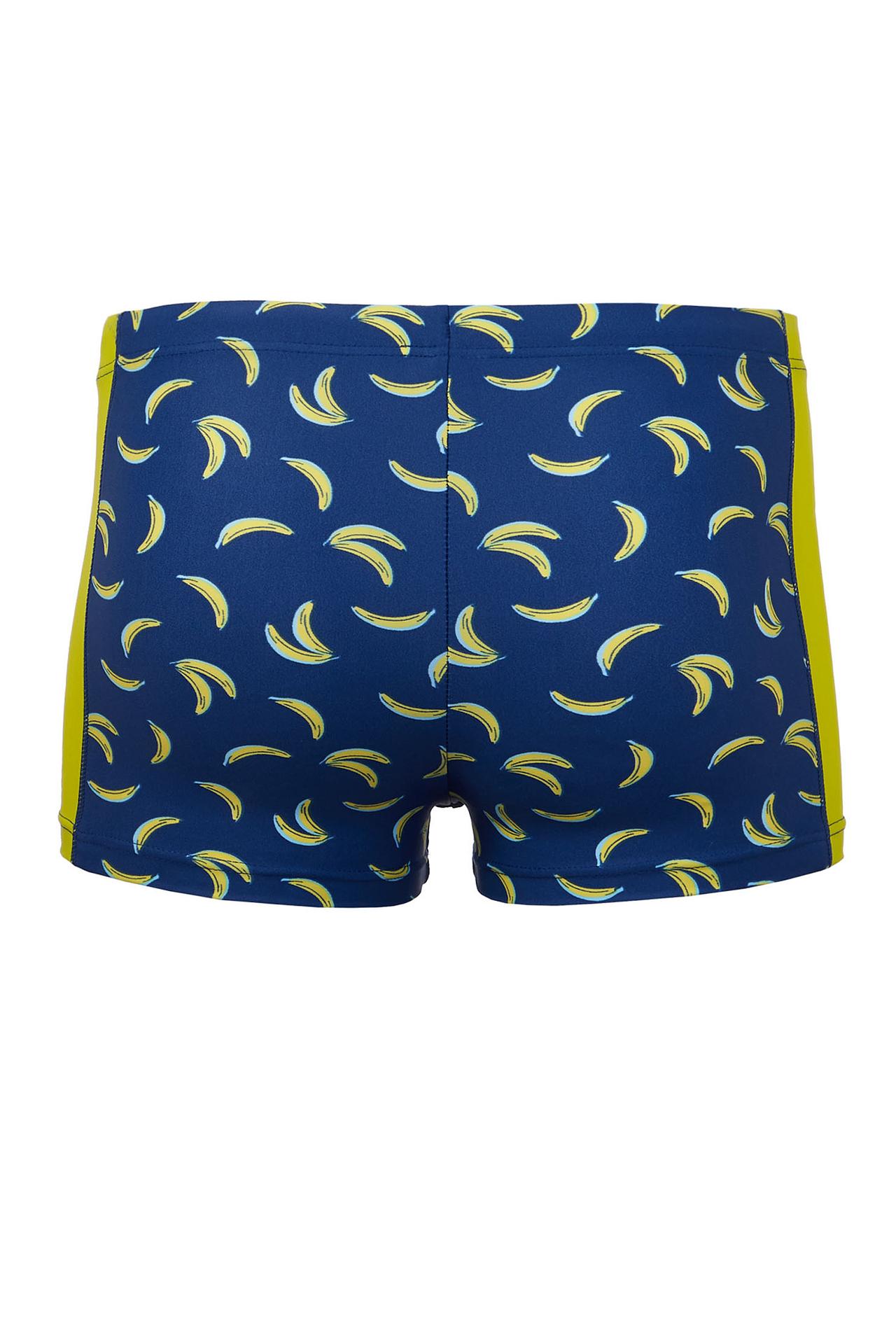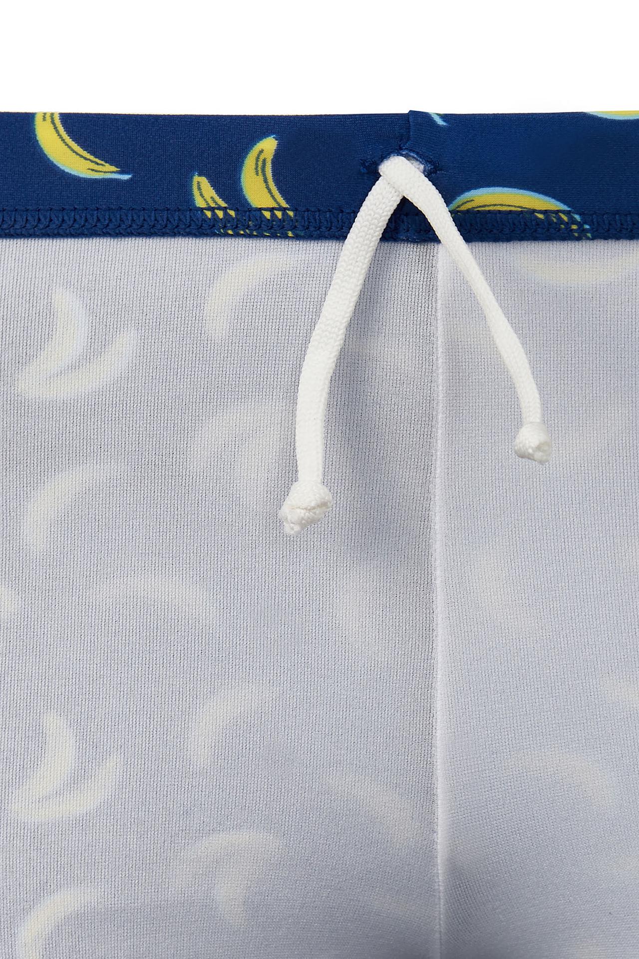- Стильный дизайн: Яркий синий цвет в сочетании с контрастными жёлтыми бананами и однотонными боковыми вставками делает эти купальные шорты по-настоящему летними и привлекательными. Такой принт обязательно понравится юным модникам.
