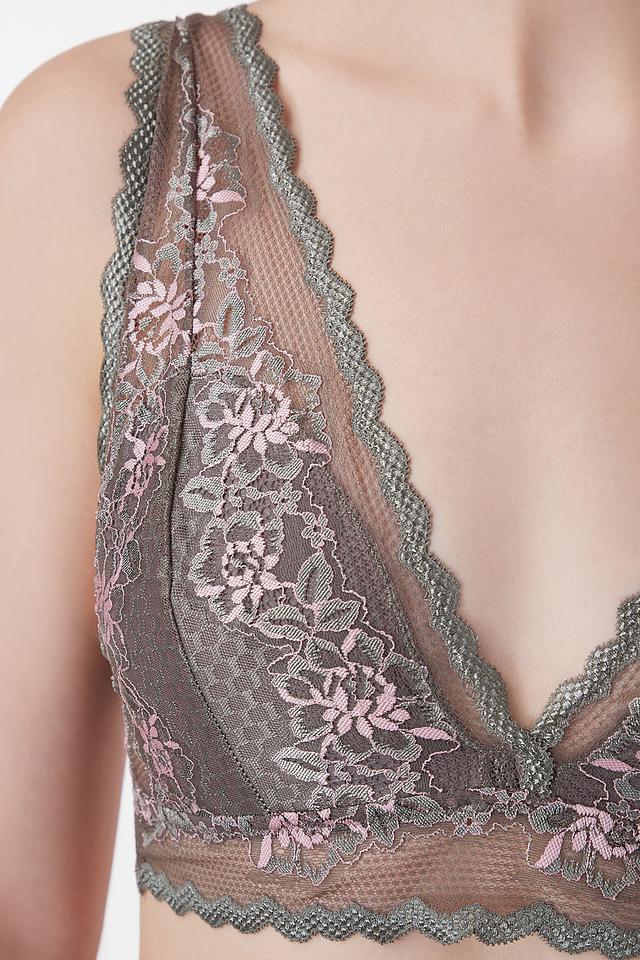 Основной цвет бюстгальтера – серый, дополненный нежным цветочным кружевом розового и светло-зеленого оттенков. V-образный вырез подчеркивает форму груди, а тонкие бретели обеспечивают дополнительную поддержку.