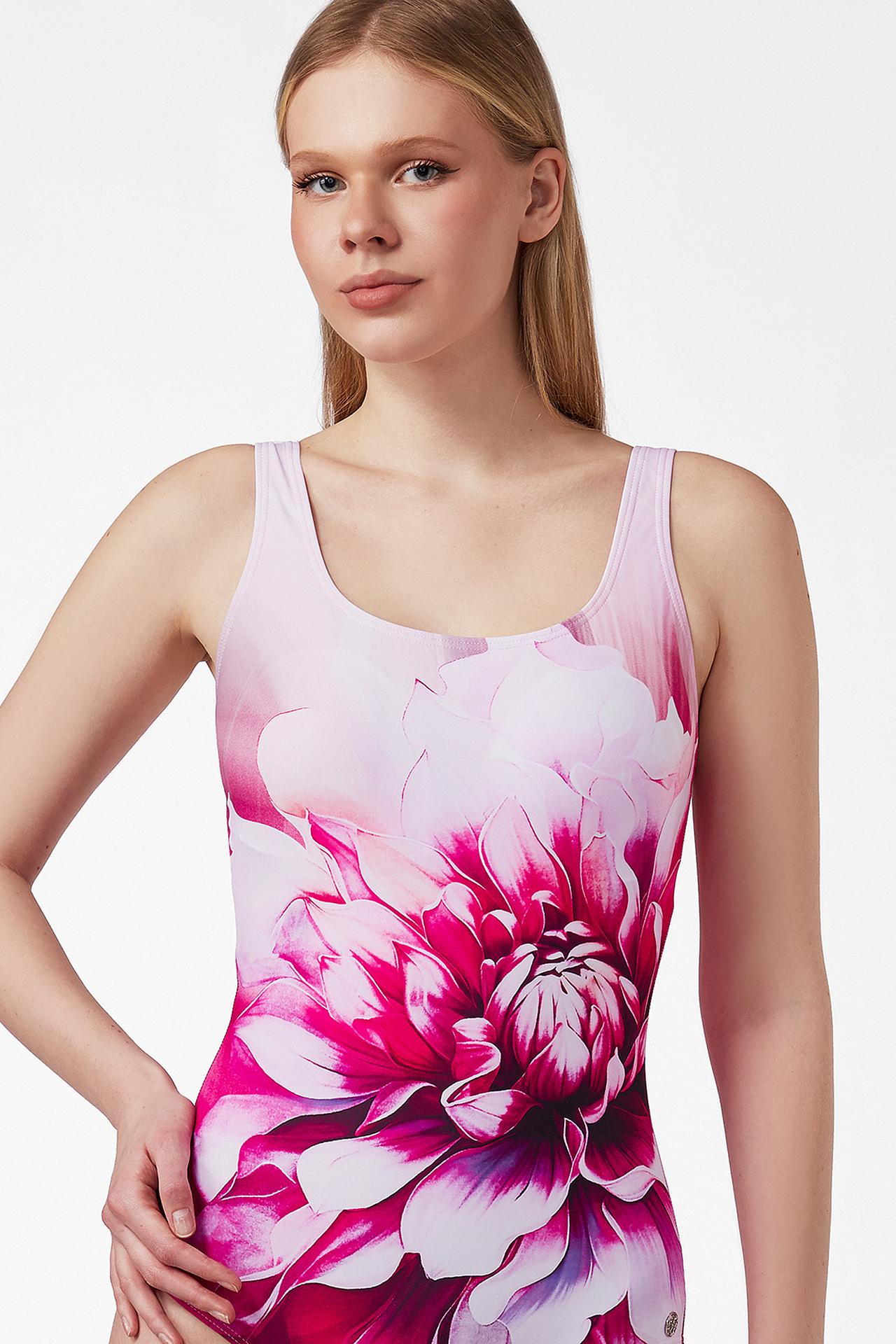 - Эффектный дизайн. Купальник украшает яркий и детализированный цветочный принт далии в оттенках розового, создающий уникальный и привлекательный образ. Градиентные переходы цвета добавляют изысканности.