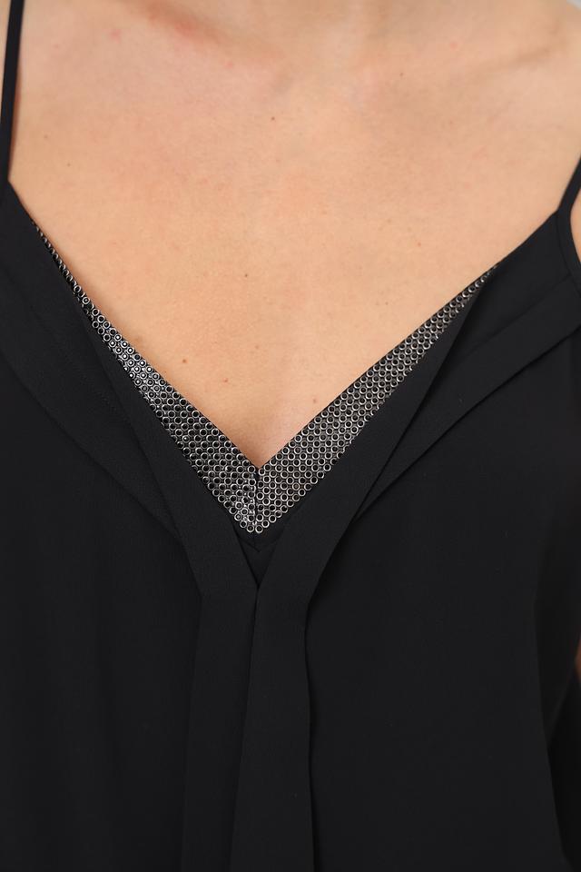 Чёрный топ от Luisa Cerano с тонкими бретелями и V-образным вырезом, украшенным деликатной вышивкой. Изготовлен из сочетания ацетата и шёлка, что обеспечивает комфорт и элегантный вид. Состав: ацетат 69%, шелк 31%