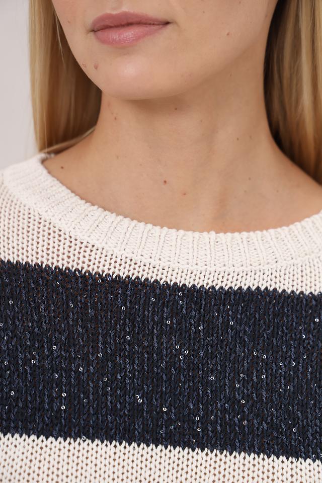 Женский пуловер Luisa Cerano кремового и тёмно-синего цвета в классическую полоску. Изготовлен из сочетания хлопка, льна, полиэстера и полиамида, что обеспечивает комфорт и практичность. Стильный и универсальный выбор для повседневного гардероба. Состав: полиэстер 28%, лен 28%, хлопок 23%, полиамид 21%