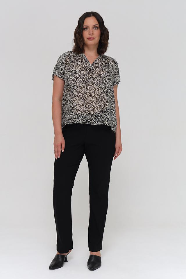 Модель имеет прямой крой, короткие рукава и V-образный вырез горловины. Блуза выполнена из 100% вискозы, что делает её приятной к телу и обеспечивает комфорт в жаркую погоду. Ткань обладает лёгкой текстурой и хорошо драпируется.