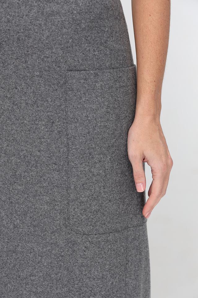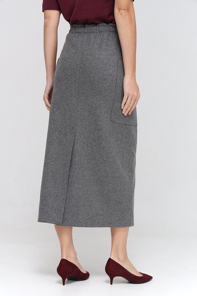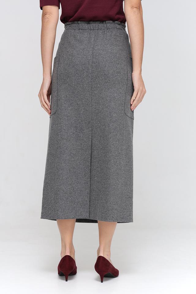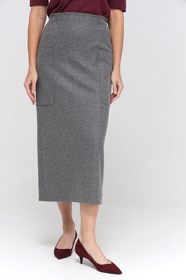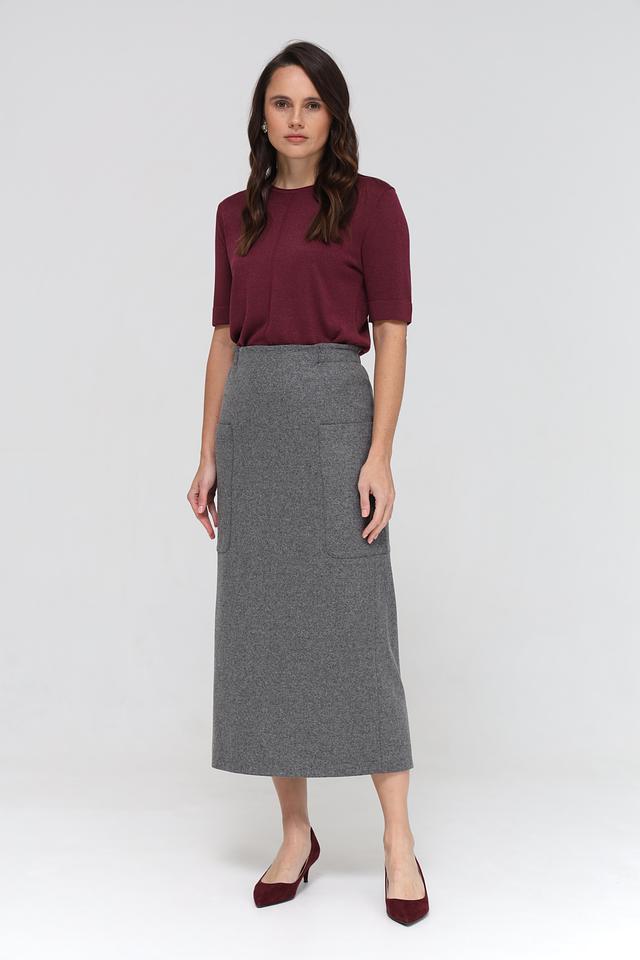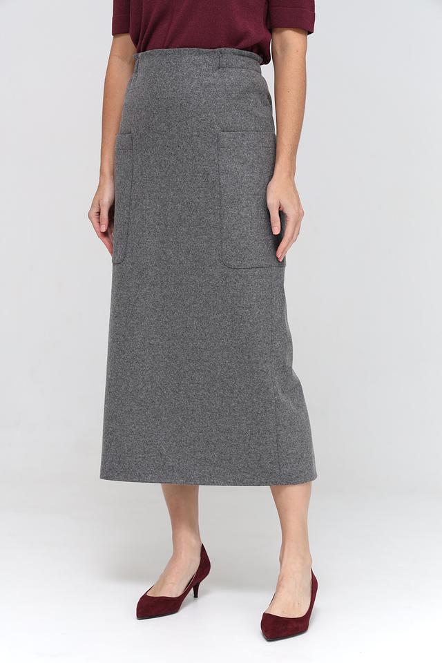 Юбка имеет прямой крой и длину миди, что делает ее универсальной для различных случаев. Эластичный пояс обеспечивает комфортную посадку по фигуре. На передней части юбки расположены два накладных кармана, добавляющие функциональности и стиля.