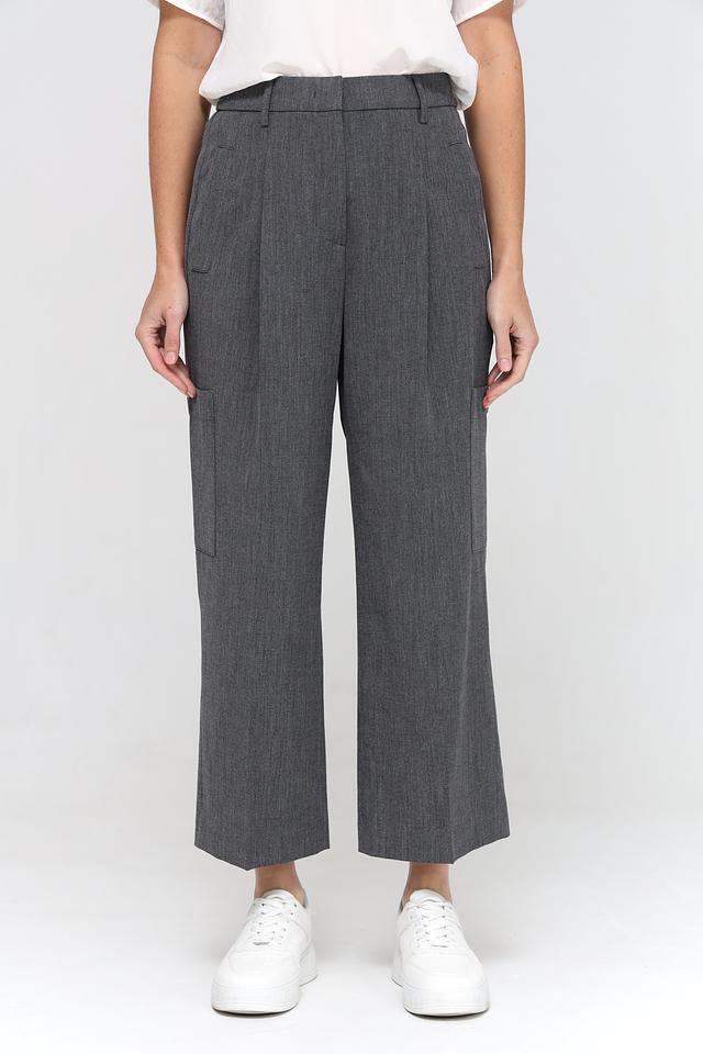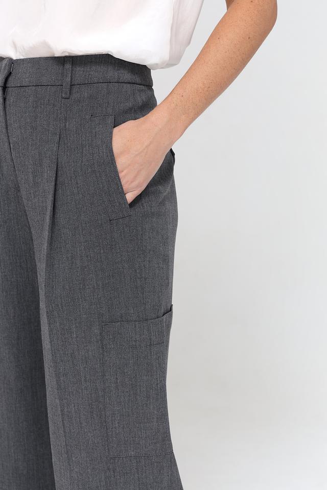 Брюки имеют прямой крой и широкую штанину, что обеспечивает свободу движений и комфорт при носке. Высокая посадка подчеркивает талию и создает силуэт. На брюках предусмотрены функциональные карманы, включая накладные карманы на бедрах, добавляющие практичности и стиля.