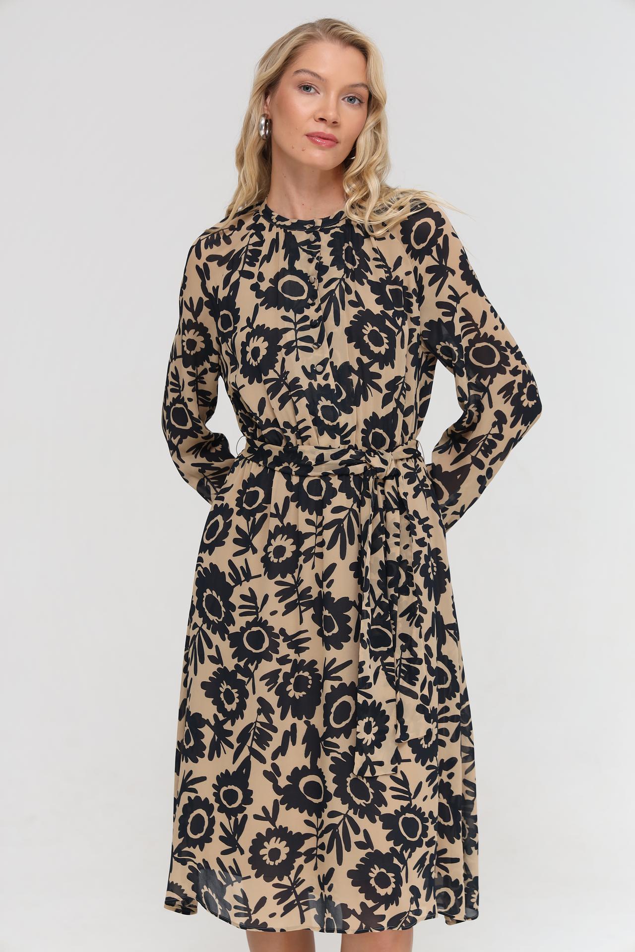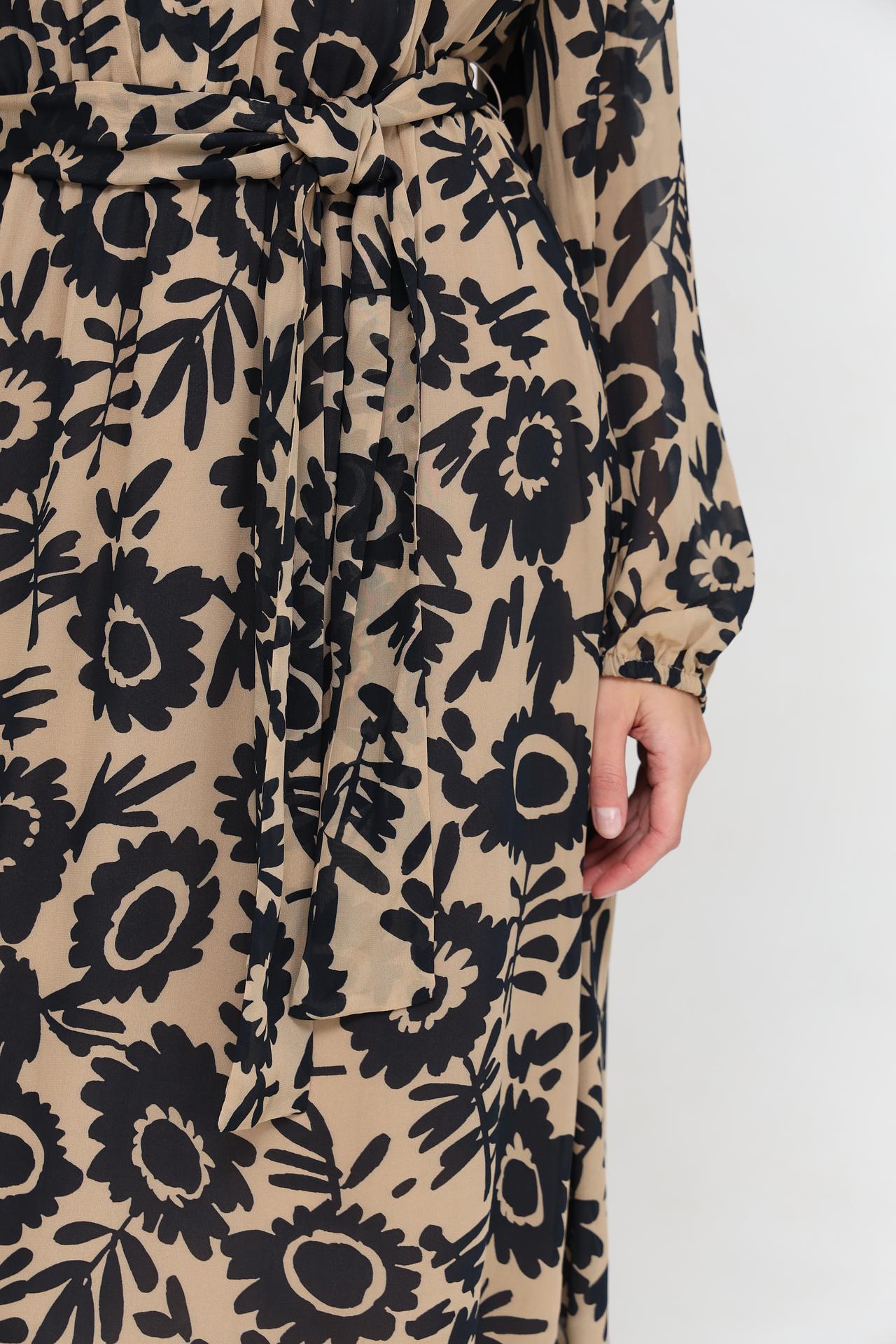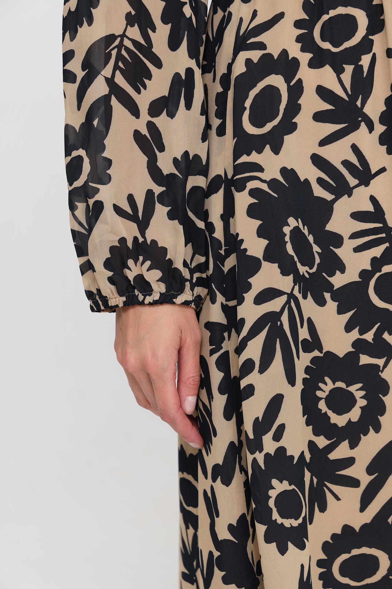 - Актуальный принт: Цветочный узор в черном цвете на бежевом фоне добавляет изысканности.
