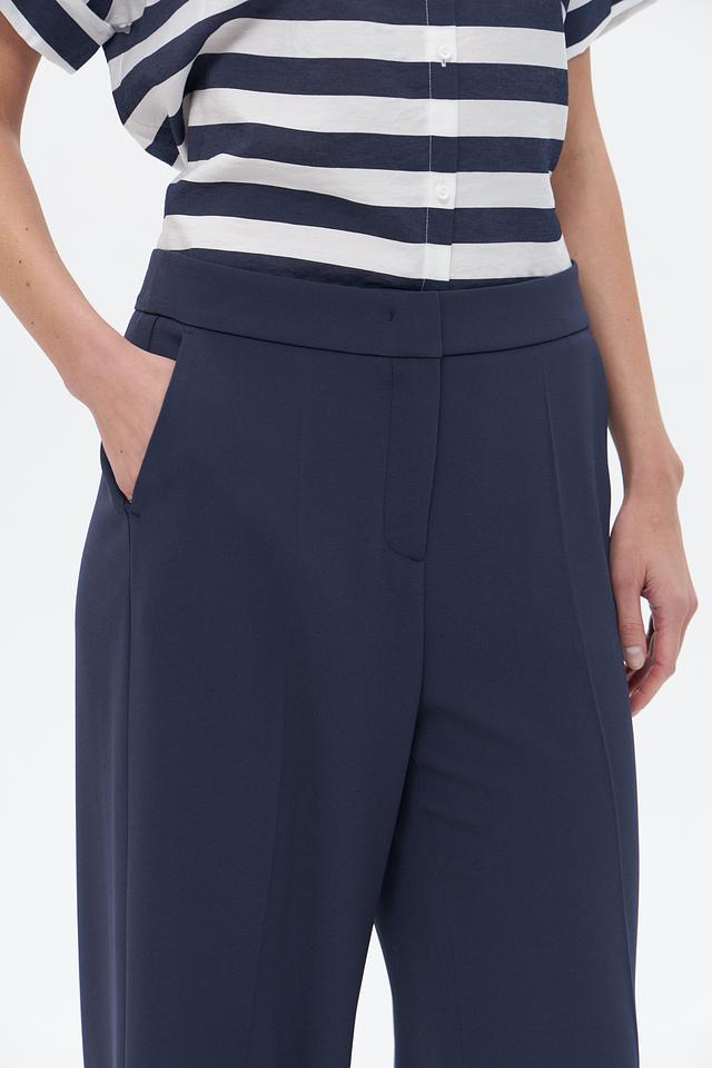 Брюки имеют прямой крой и широкие штанины, что обеспечивает свободу движений и создает изысканный силуэт. Высокая посадка подчеркивает талию и визуально удлиняет ноги. Модель дополнена боковыми карманами и задними карманами с клапанами.