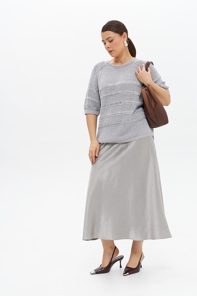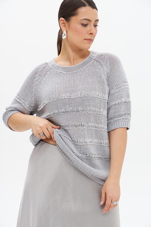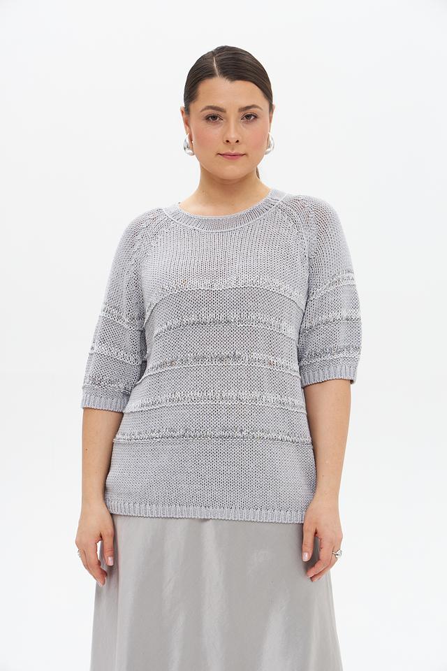 Серый пуловер от Luisa Cerano с коротким рукавом и оригинальным узором. Изделие выполнено из смесовой ткани, сочетающей в себе лен, хлопок и полиамид, что обеспечивает комфорт и воздухопроницаемость. Состав: лен 33%, хлопок 30%, полиамид 25%, полиэстер 6%, вискоза 5%