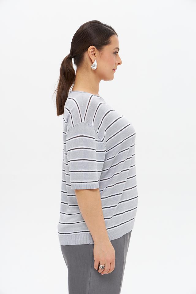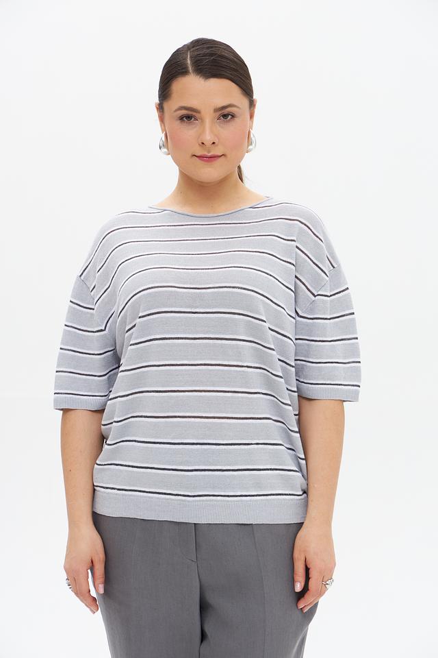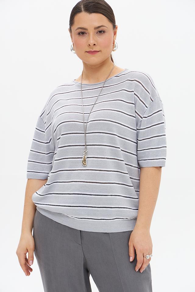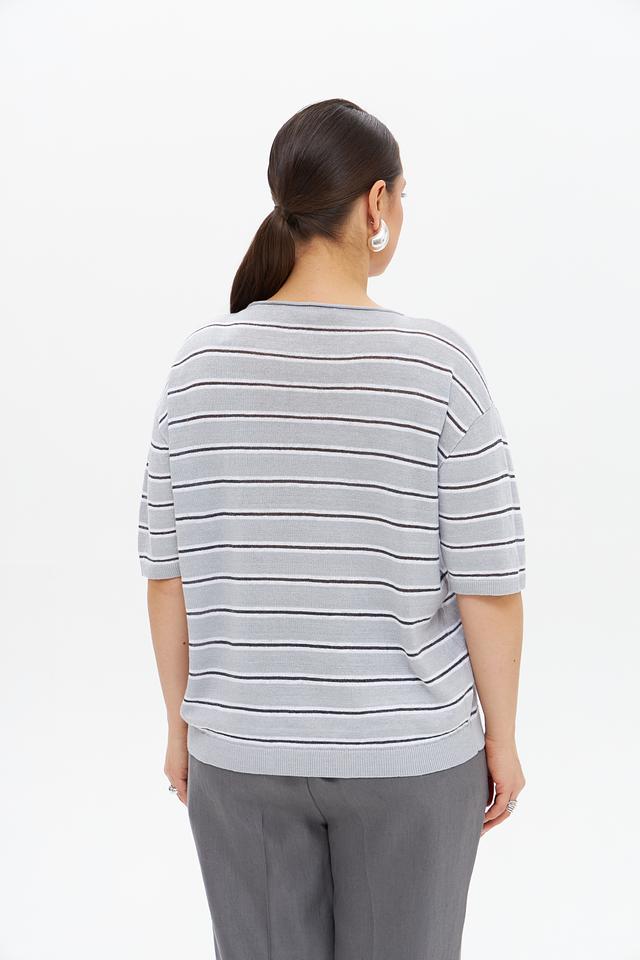 Пуловер имеет свободный крой, который обеспечивает комфорт и свободу движений. Короткие рукава делают его идеальным выбором для теплой погоды. Изготовлен из высококачественного трикотажа, состоящего из 90% льна, 5% полиэстера и 5% вискозы, что обеспечивает приятные тактильные ощущения и долговечность изделия.