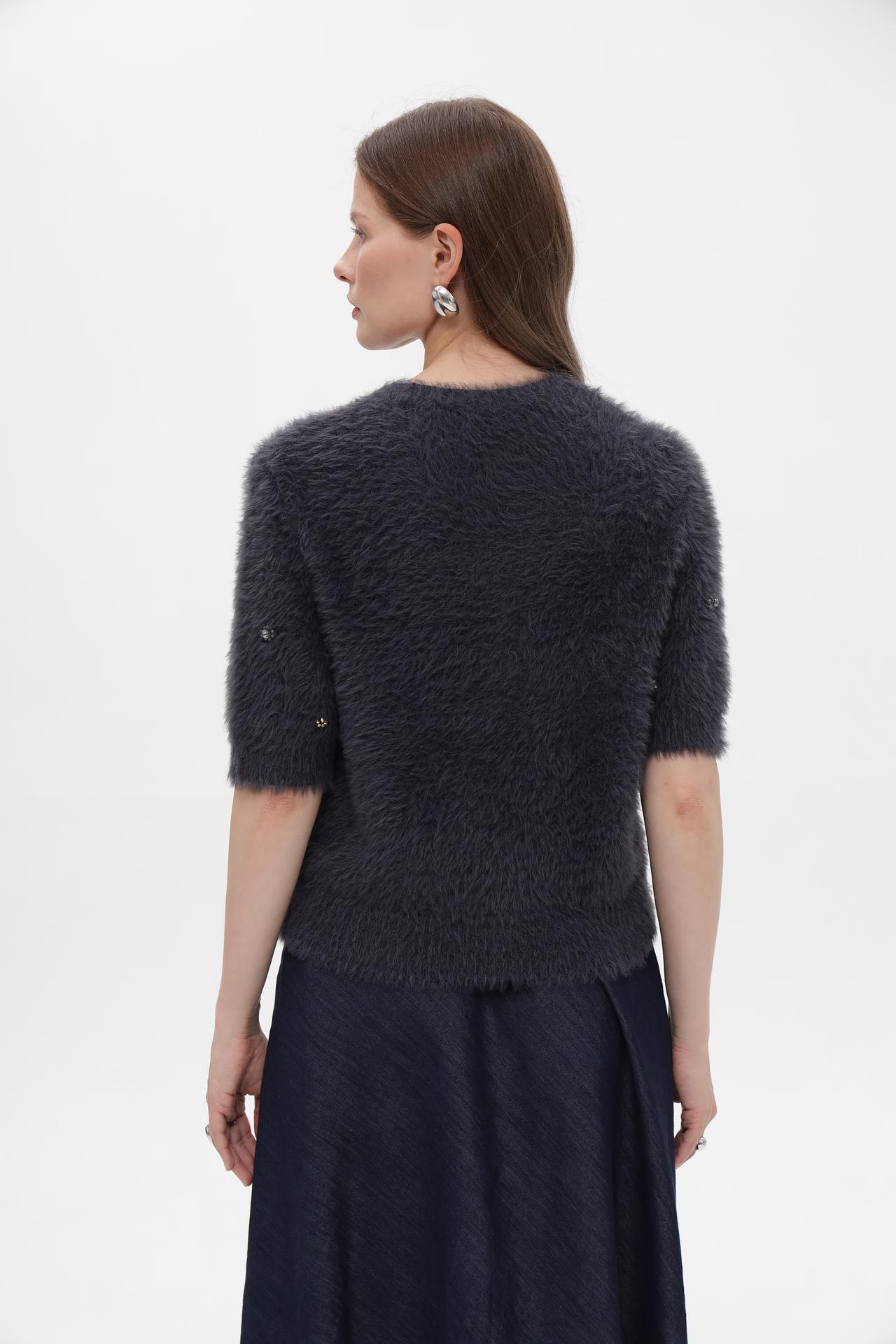 - Дизайн: Укороченный рукав и круглый вырез горловины. Пушистая текстура пряжи создает объем и нежность, а россыпь кристаллов и декоративных элементов добавляет акцент.