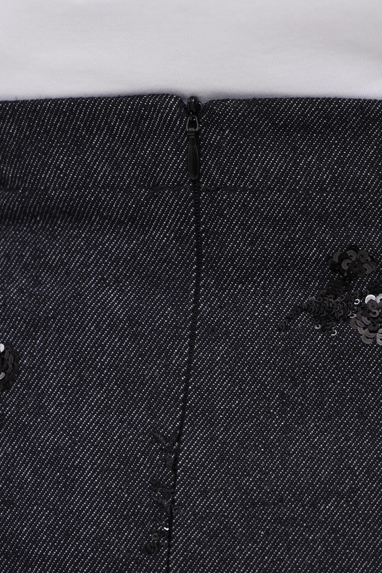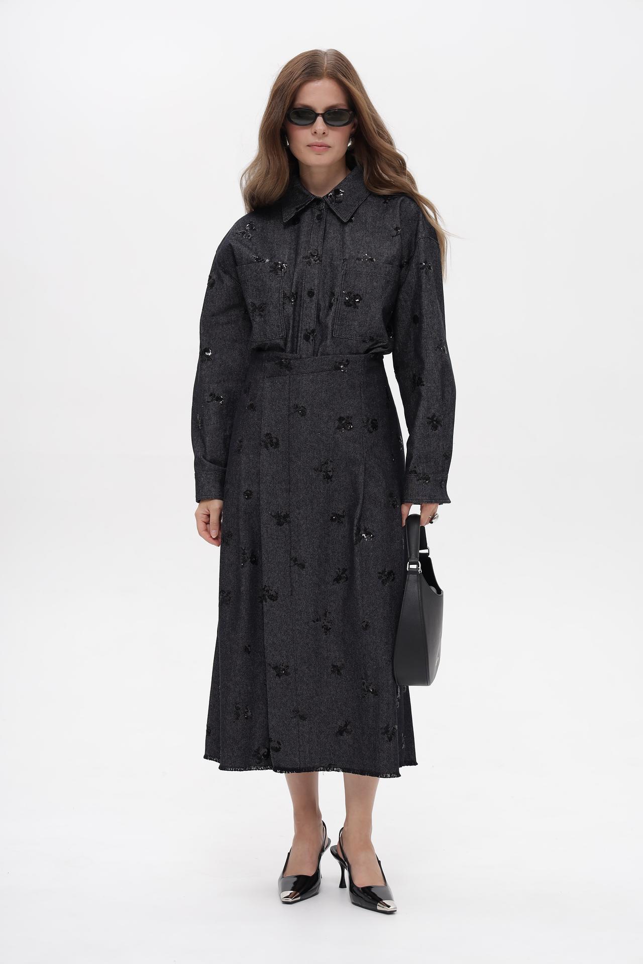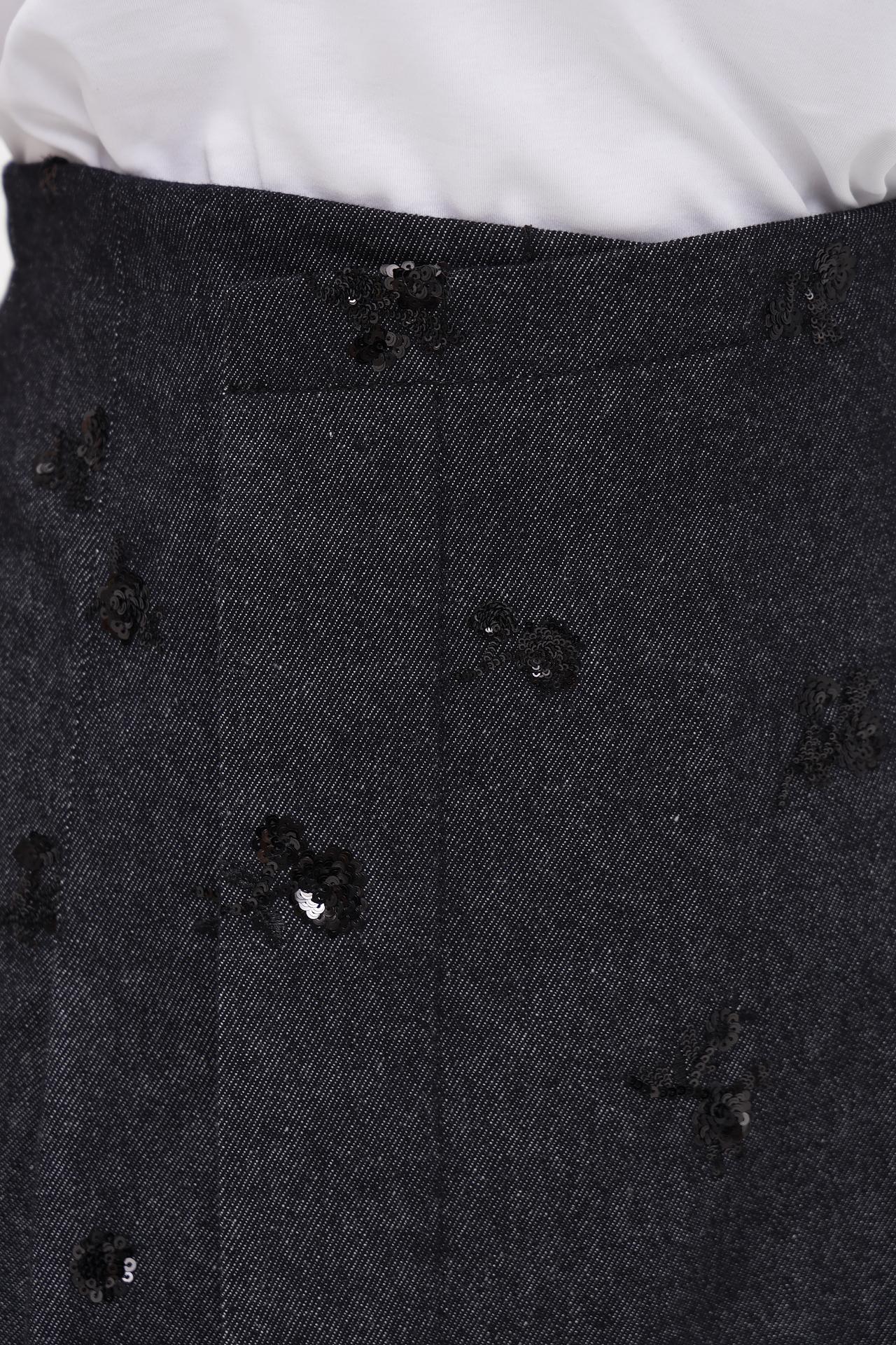 - Дизайн: Классический крой миди с акцентом на декоративные элементы. Юбка украшена россыпью пайеток, имитирующих цветочный узор, что придает ей изысканность.