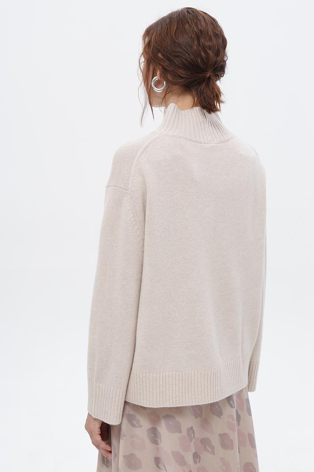 Пуловер имеет прямой крой и высокий горл, что придает ему изысканность и позволяет носить его как самостоятельный элемент, так и под верхнюю одежду.